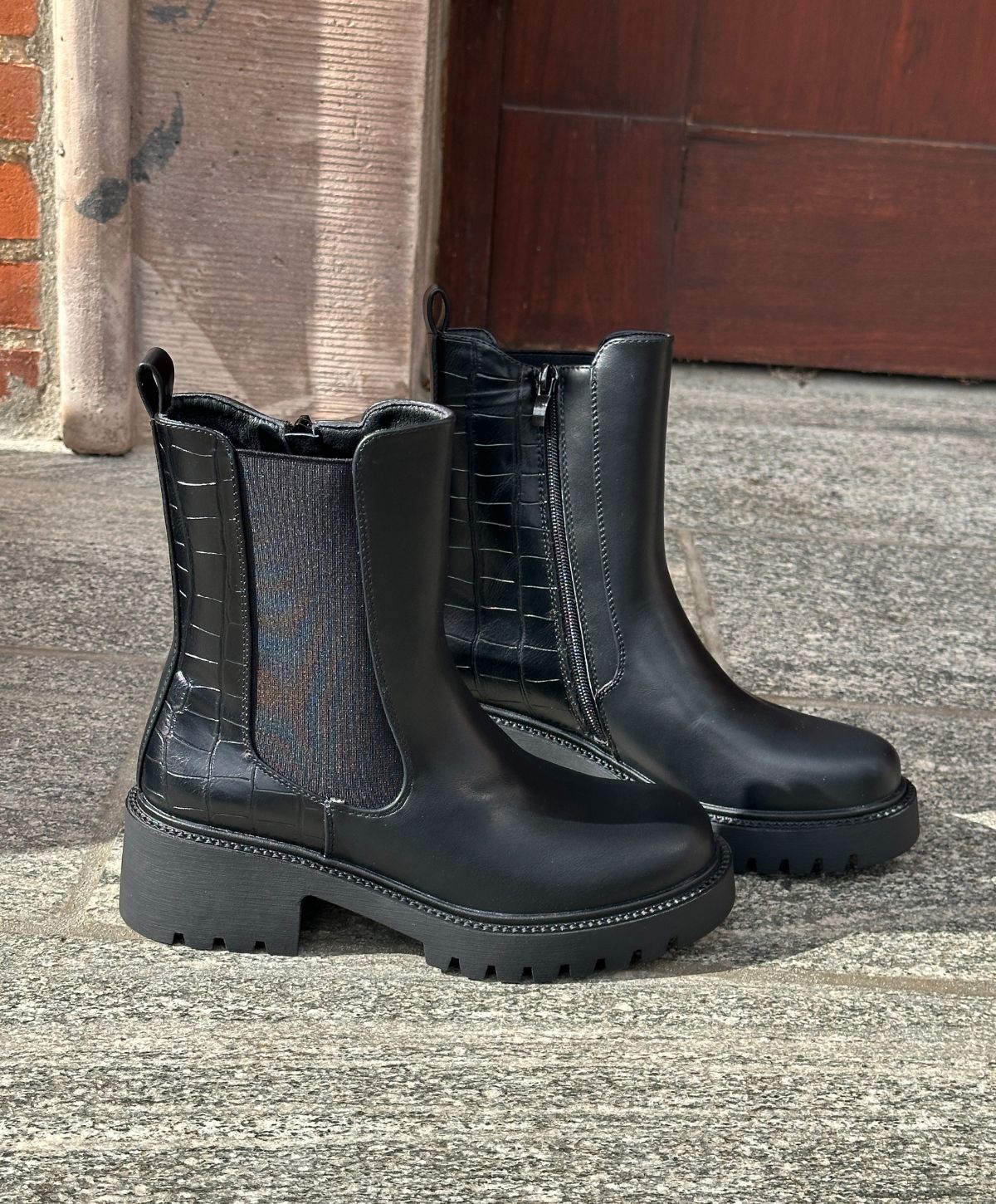Smuk og stilren sort støvle i imiteret skind, der kombinerer enkelt design med trendy detaljer. Støvlen har en blød elastik i siden, der giver en fleksibel pasform, samt en solid gummisål, som sikrer komfort og stabilitet i hverdagen. Den blanke overflade i kombination med den let markerede struktur bagtil giver et elegant og moderne udtryk.