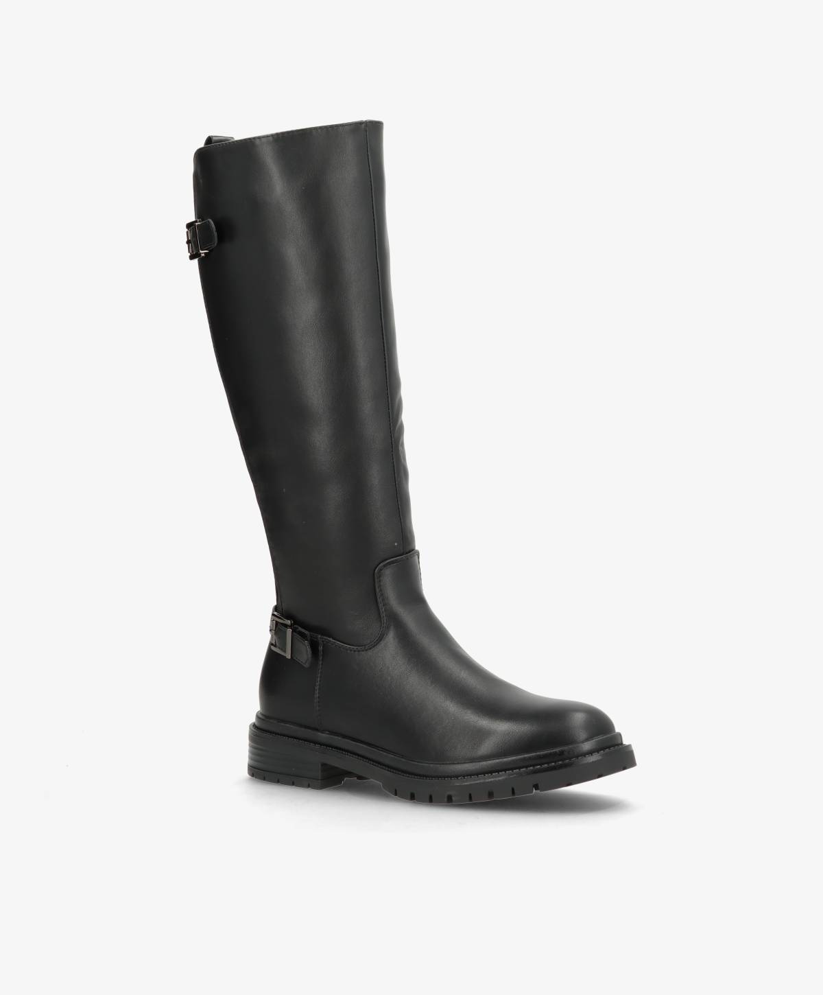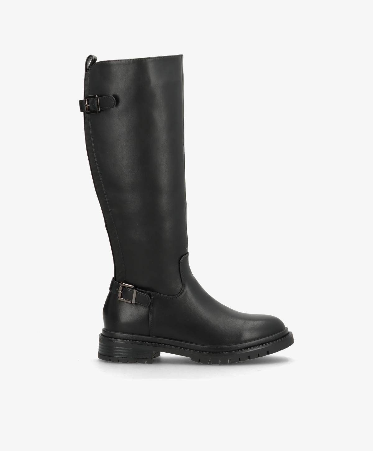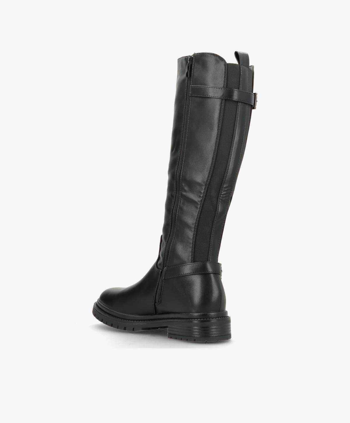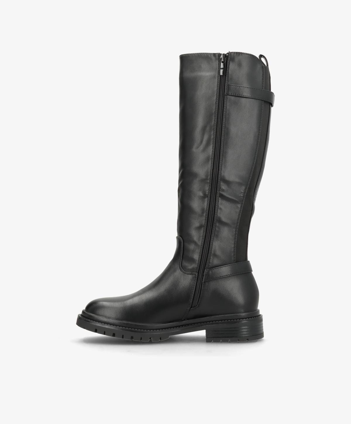 ENYA fra Havanna Shoes er en stilren knæhøj støvle med et moderne og funktionelt udtryk. Fremstillet i sort imiteret læder, kombinerer den en klassisk silhuet med praktiske detaljer som elastik i skaftet og spænder både foroven og ved anklen.