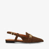 ABOVE S fra phenumb copenhagen er en elegant slingback i mørkebrun ruskind med et sofistikeret og moderne udtryk. Den varme brune nuance tilfører dybde og eksklusivitet, mens de gyldne metaldetaljer på fronten skaber et raffineret blikfang. Den spidse silhuet giver et feminint og strømlinet look, der fremhæver fodens form på smukkeste vis.