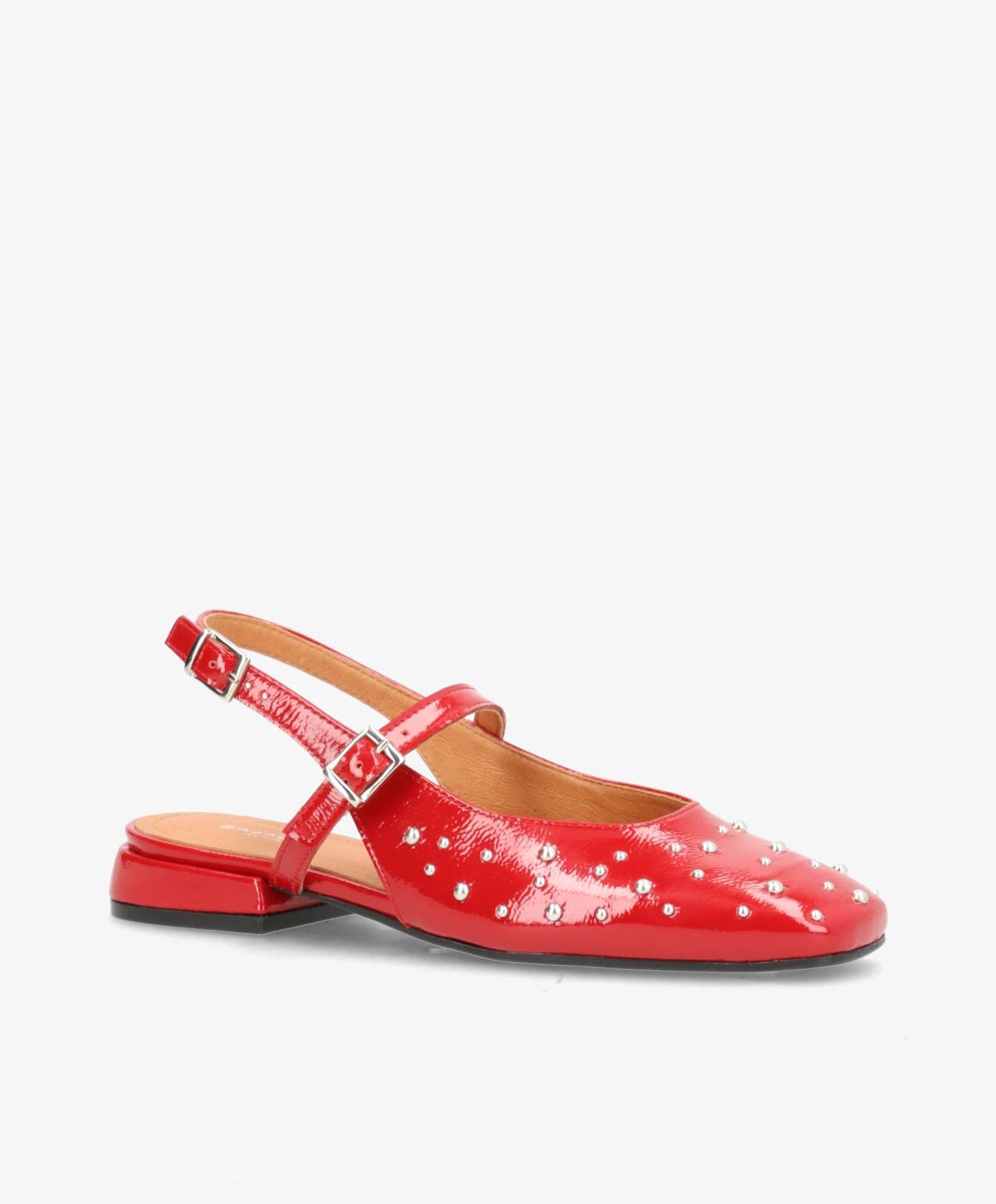Gør indtryk med et par ADVANCE P slingback fra phenumb copenhagen – en statement slingback i glansfuldt rødt lak læder med fine sølvfarvede nitter. De justerbare remme omkring anklen og foden giver både stil og perfekt pasform, mens den lave hæl sikrer komfort hele dagen. En sko, der forener det feminine med en kantet attitude.