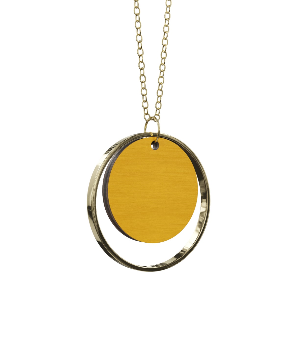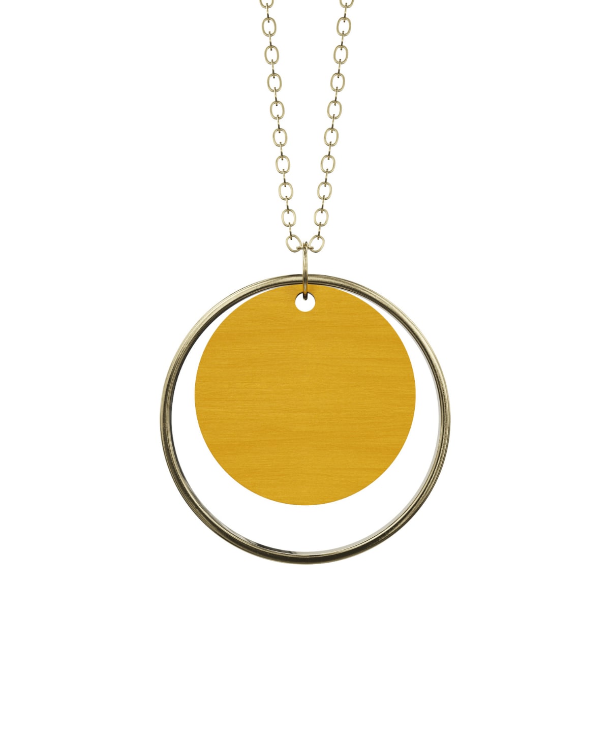 Smuk halskæde fra Grundled lavet i farvet træ, med en fin forgyldt ring omkring. Halskæden lukkes bagtil med lås og er udført i nikkelfri metal. Halskæden måler desuden omkring 40 cm.