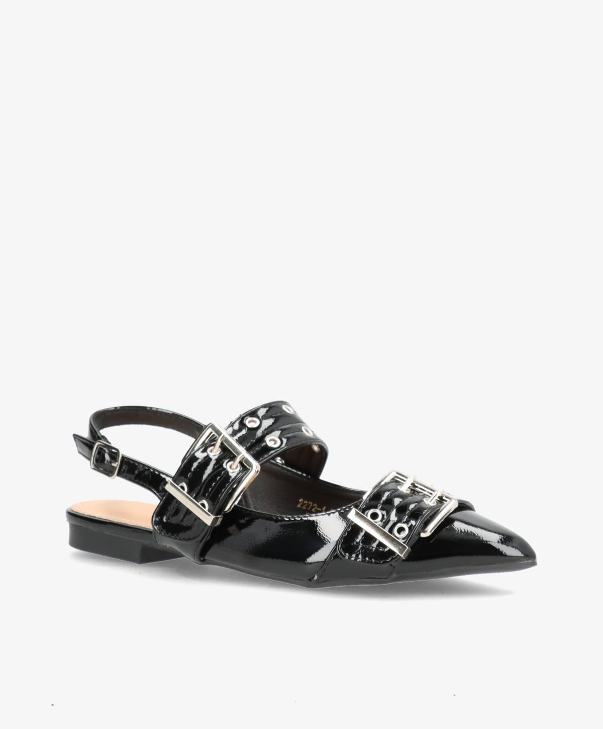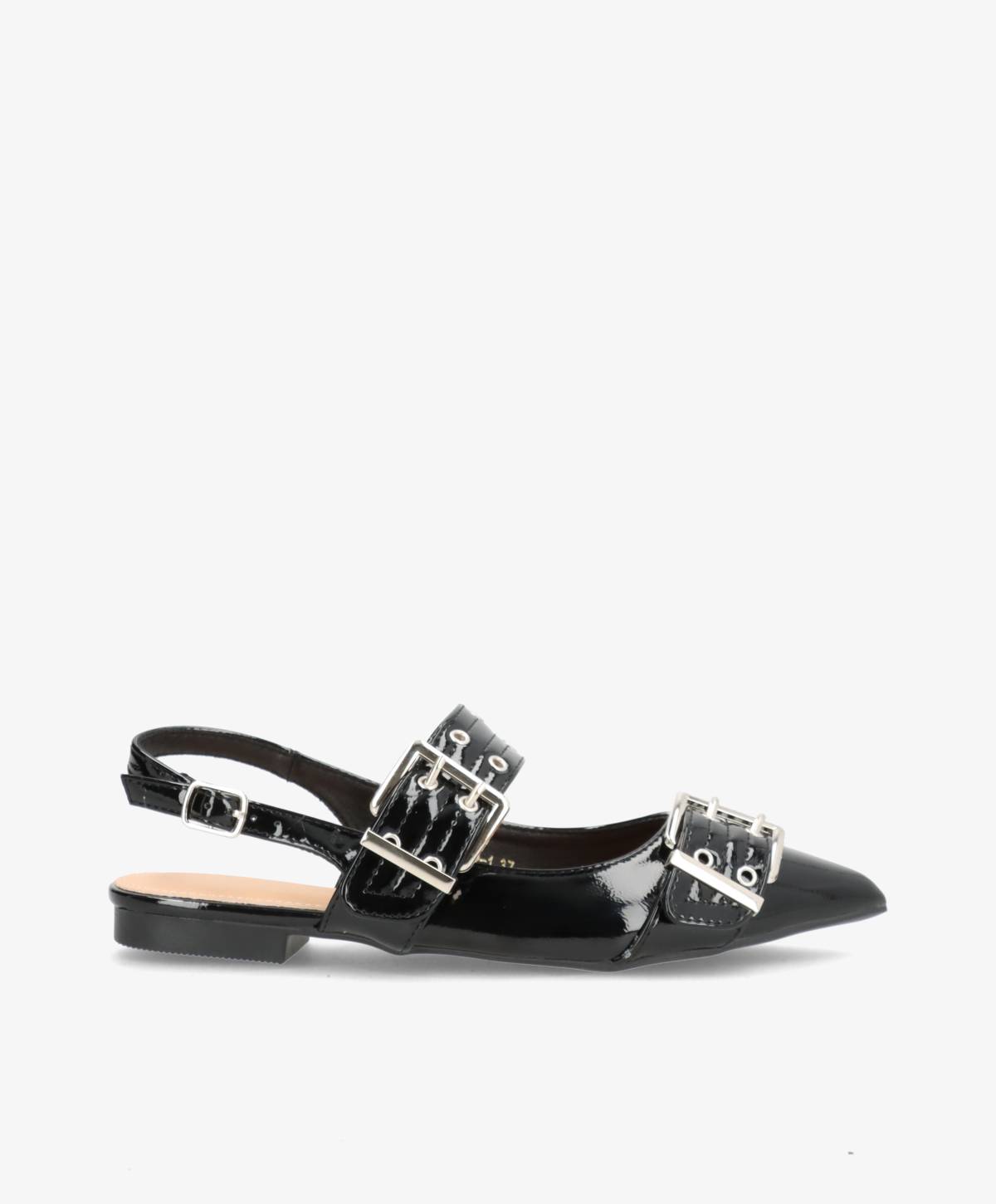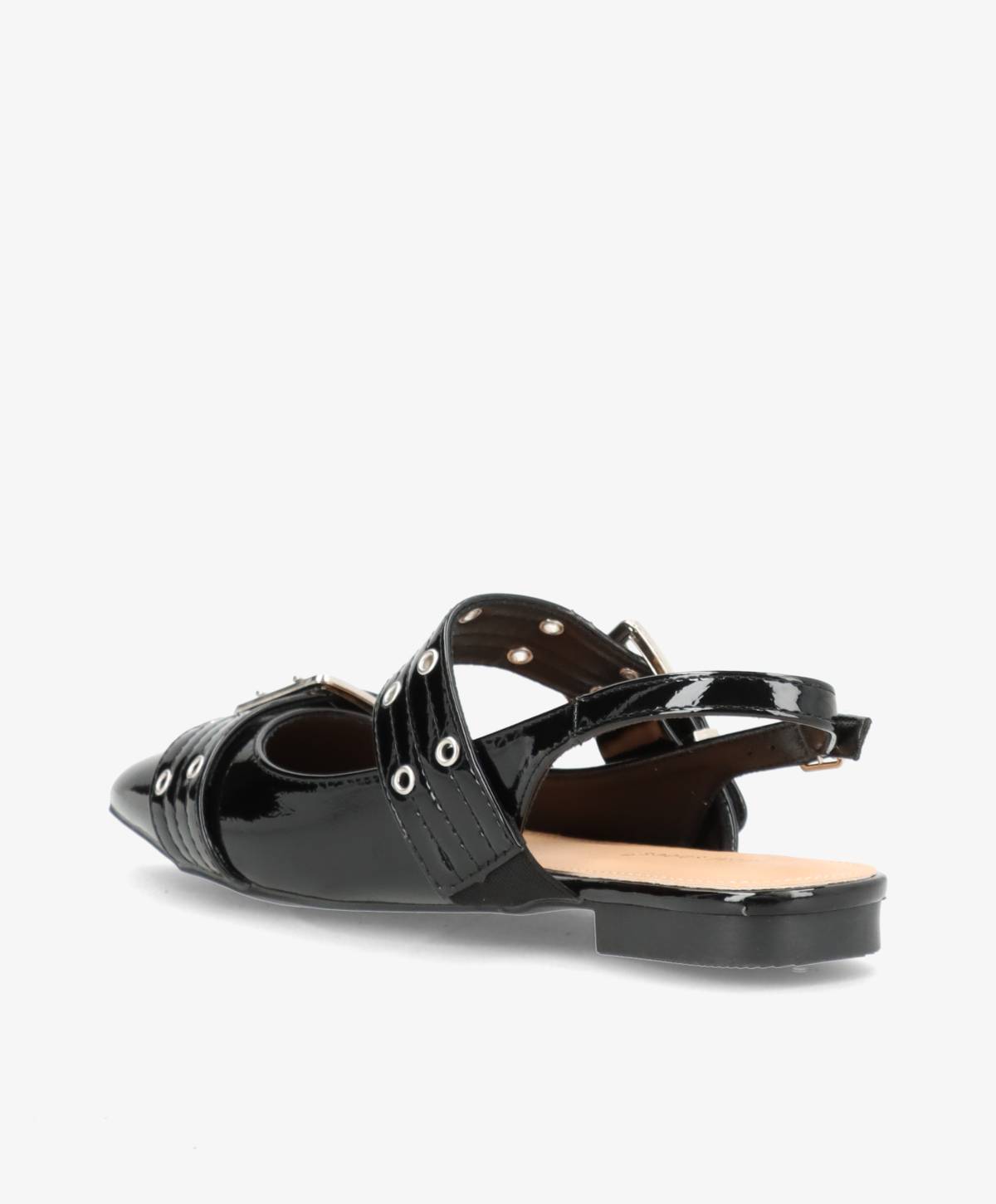 Skil dig ud med ALBI sandalen i sort imiteret lak – en edgy og sofistikeret tilføjelse til din sommergarderobe. Med sit spidse snit, dekorative dobbeltspænder og metaløjer, kombinerer den moderne attitude med feminin elegance. Den justerbare hælrem sikrer en behagelig pasform, og det glinsende laklook giver et eksklusivt udtryk til både hverdags- og aftenbrug.