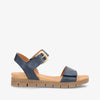 AMALFI fra Shoedesign Copenhagen er en feminin kilehæls sandal i smukt jeansblåt læder, der kombinerer komfort og elegance i ét stilrent design. Den brede forfodsstrop og den justerbare ankelrem med guldfarvet spænde giver et eksklusivt udtryk og sikrer samtidig en stabil og behagelig pasform.