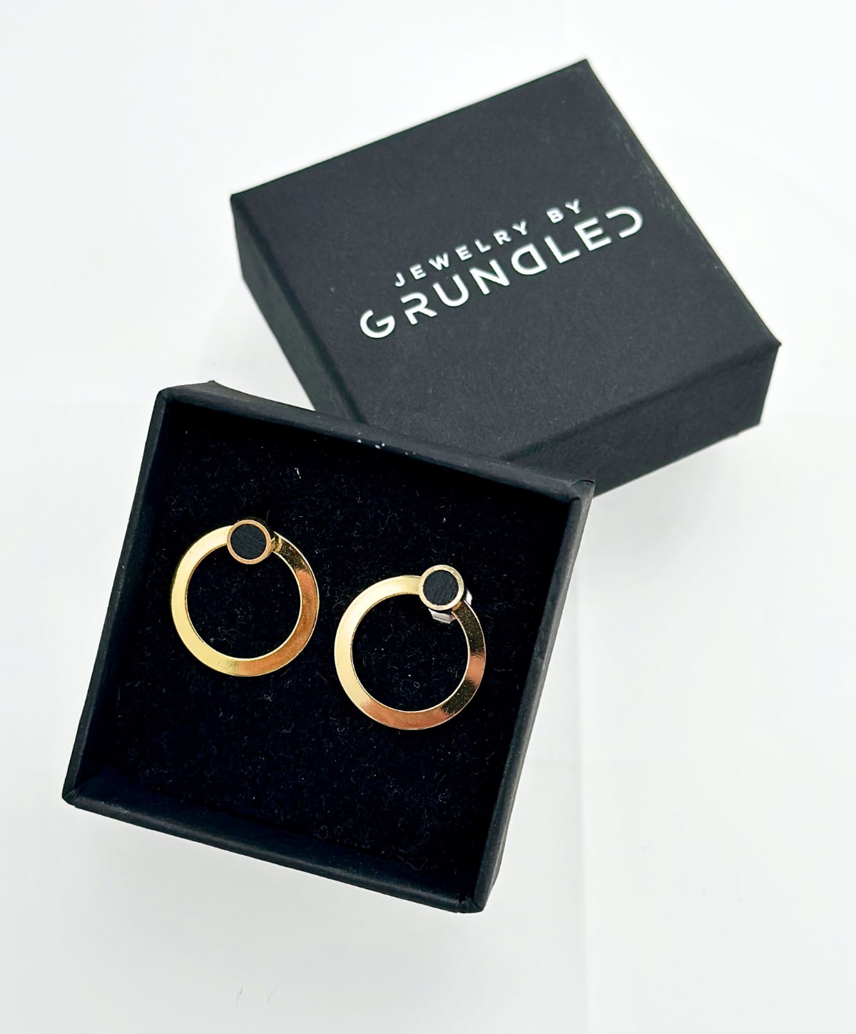 Smukke ørestikker fra Grundled i et forgyldt metal med en cool trædetalje. De flotte ørestikker har en rund form, der giver illusionen af hoops, mens de lukkes bagtil med en standard lås. Ørestikkerne har et tidløst look, der kan bruges til både fest og hverdag. De måler 15 mm i diameter.