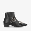 BELLE er en moderne ankelstøvle med et skarpt og stilrent udtryk. Den spidse snude og sølvfarvede spænder giver støvlen et feminint, men kantet look, der skiller sig ud i garderoben. Den bløde overflade i sort læderlook kombineret med praktisk lynlås i siden gør den både komfortabel og nem at tage på.