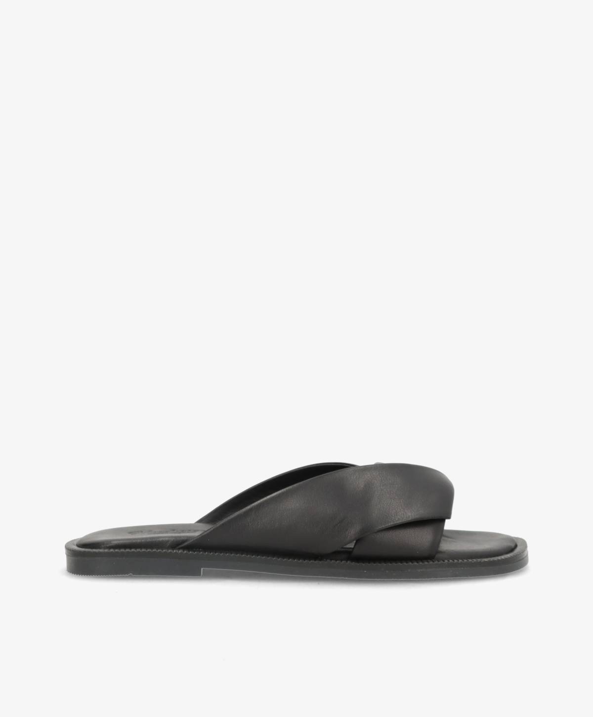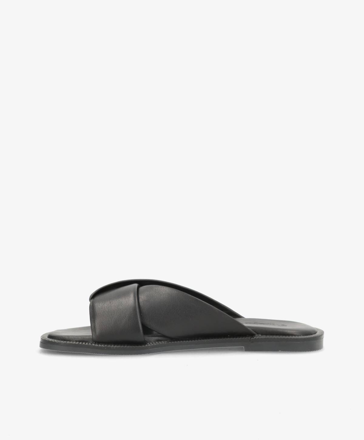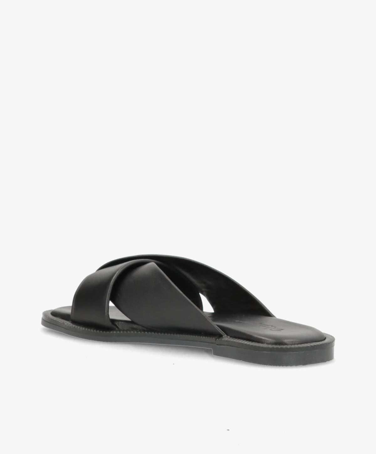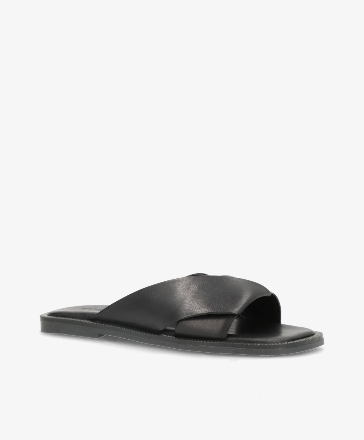 BRIGITTE fra Shoedesign Copenhagen er en stilren slipper i eksklusivt sort glat læder, der udstråler moderne minimalisme. De brede, krydsede remme giver et elegant og balanceret udtryk, mens den sorte farve gør modellen alsidig og let at kombinere med både casual og mere sofistikerede outfits.