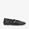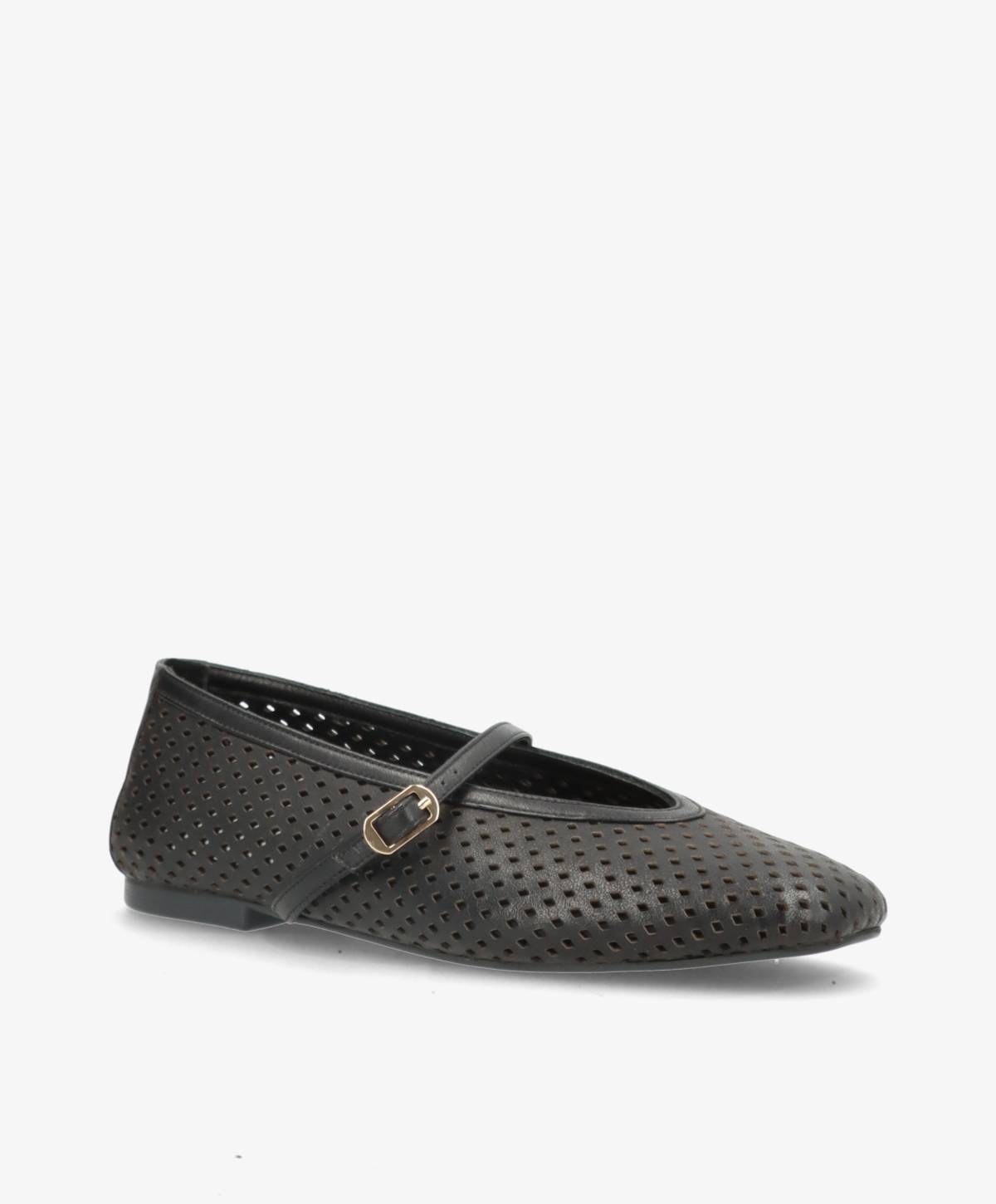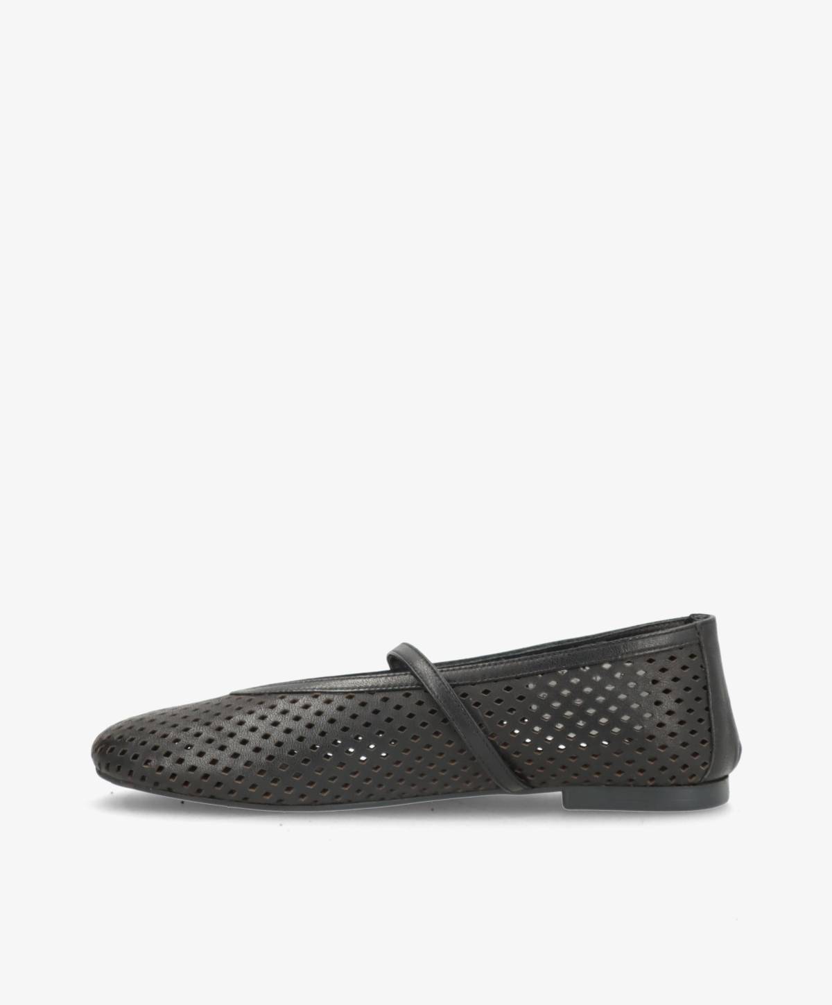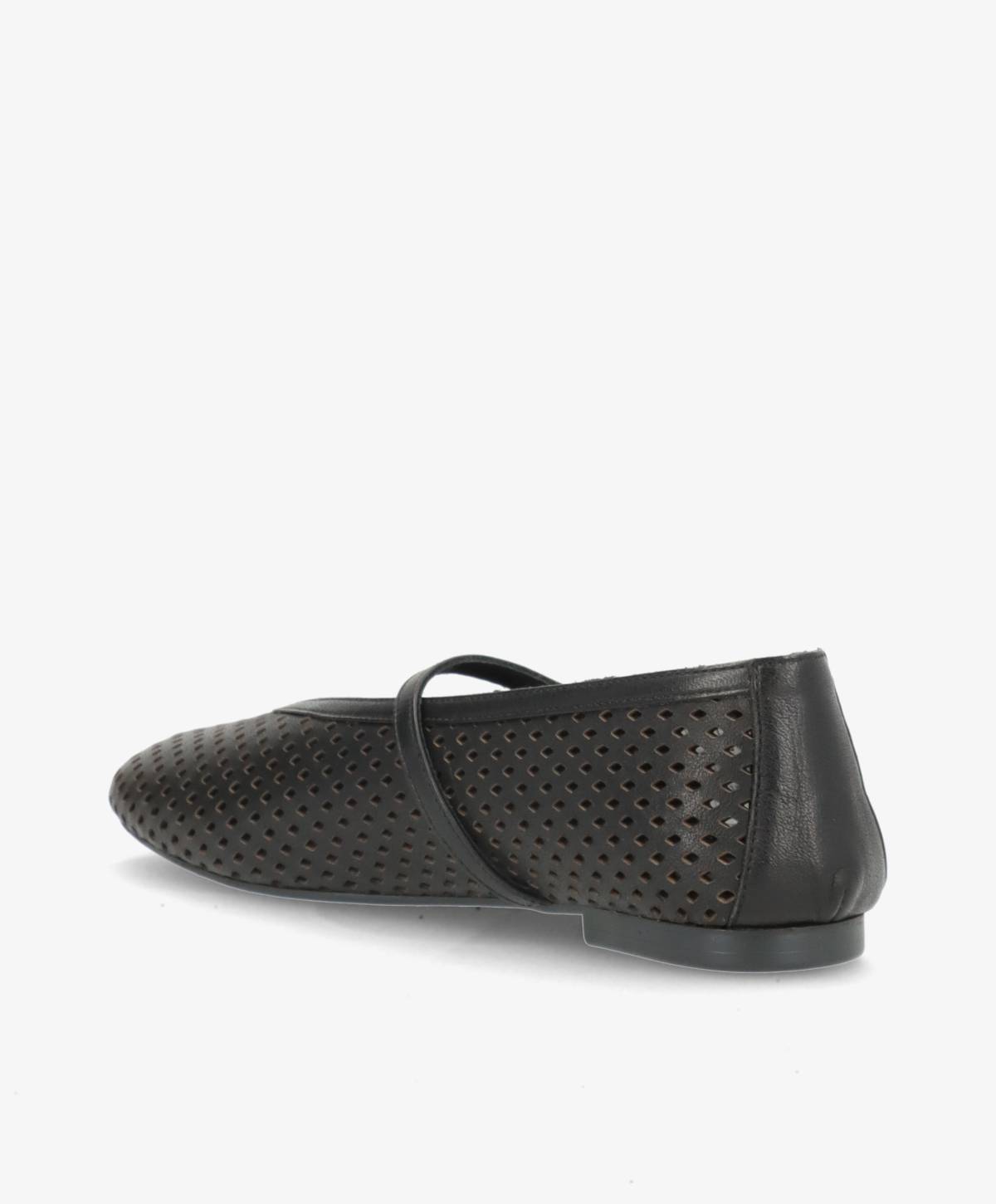 CHRISTY er en elegant og feminin ballerina i blødt sort læder fra Shoedesign Copenhagen. Designet kombinerer et klassisk udtryk med fine, moderne detaljer i form af det perforerede mønster, der giver skoen et let og luftigt look. Den justerbare rem over vristen med diskret guldspænde tilfører et sofistikeret touch og sikrer samtidig en behagelig og stabil pasform.