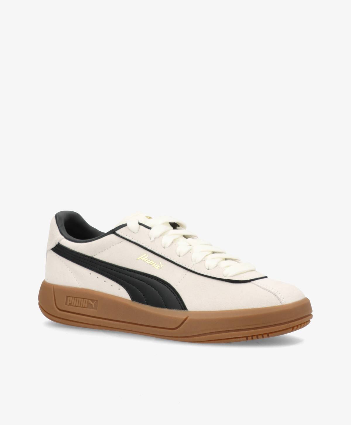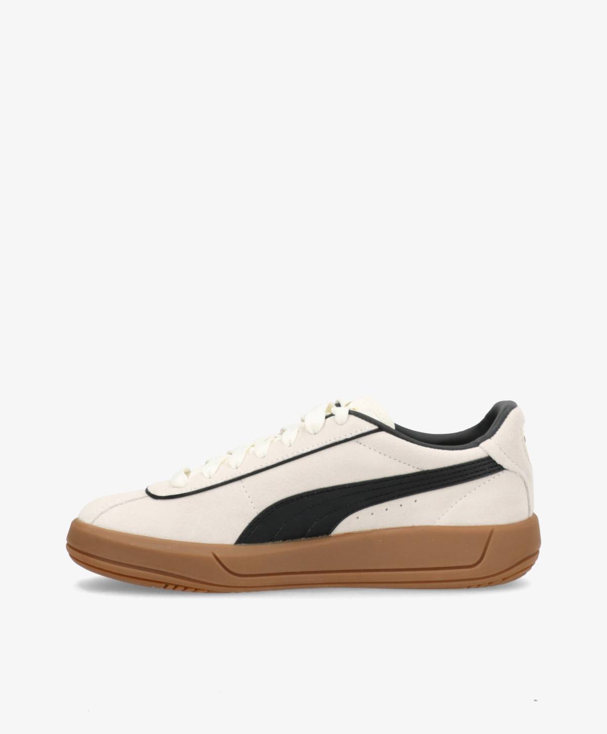 PUMA CLUB KLASSIKA SD leverer en tidløs sneaker med en cremefarvet ruskindsoverdel og skarpe sorte detaljer. Den brune gummisål tilføjer et strejf af vintage og fuldender looket med et retro-inspireret udtryk, der aldrig går af mode. Guldlogoet giver et eksklusivt touch, mens snørelukningen sikrer et fast og behageligt fit.
