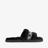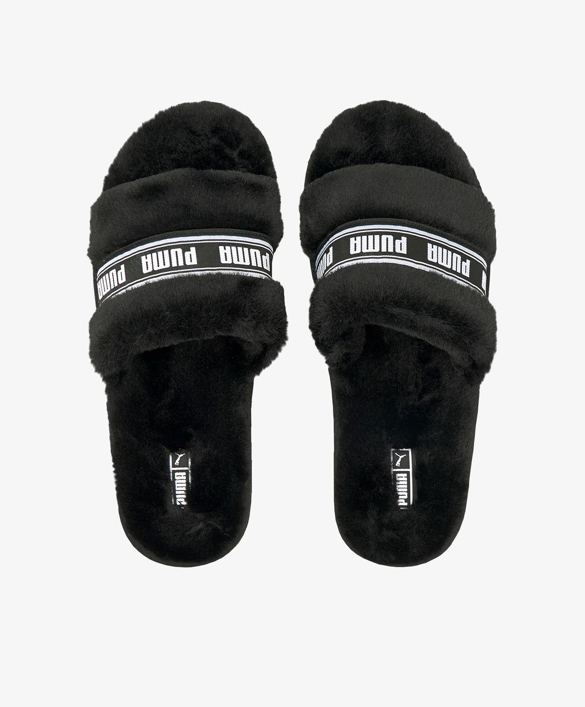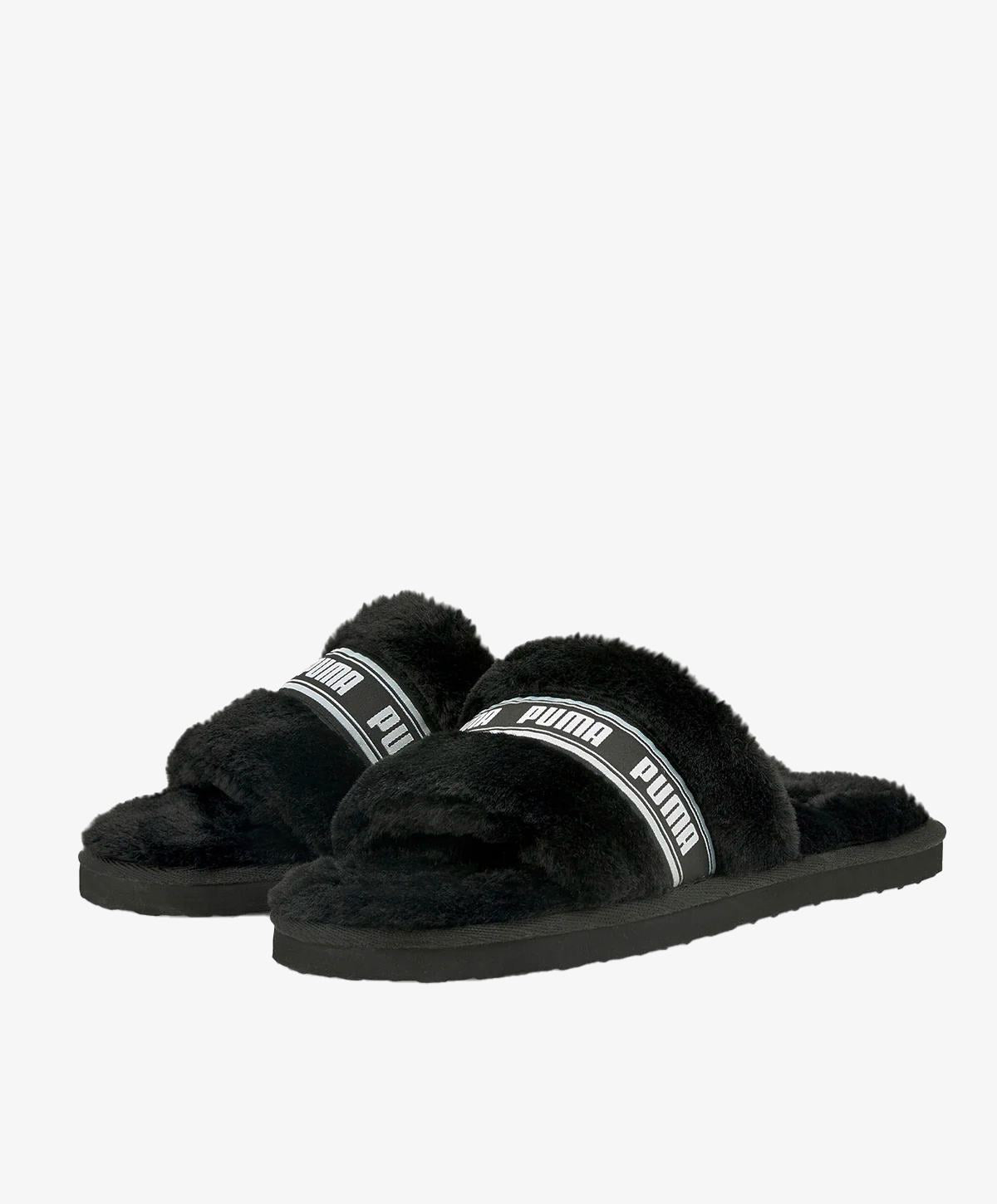 Super trendy tøffel med kunstpels og logobånd over foden. Modellen har en tekstilbund og kan derfor både bruges indendørs og udendørs.