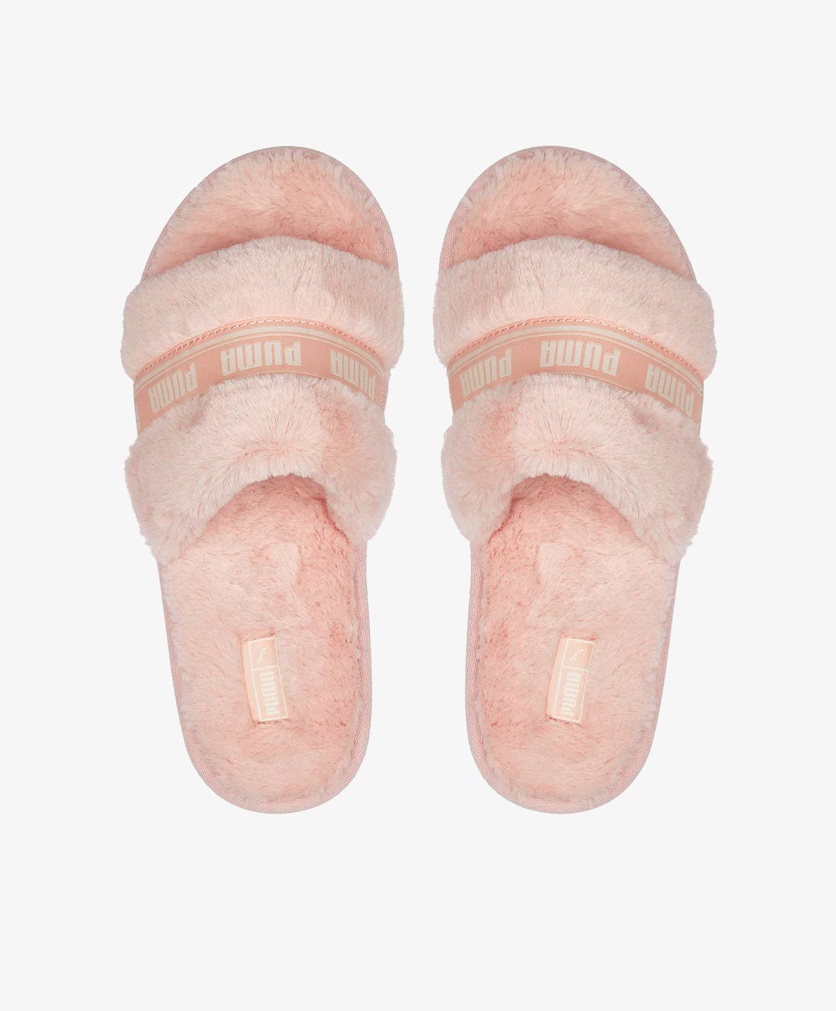 Super trendy tøffel med kunstpels og logobånd over foden. Modellen har en tekstilbund og kan derfor både bruges indendørs og udendørs.