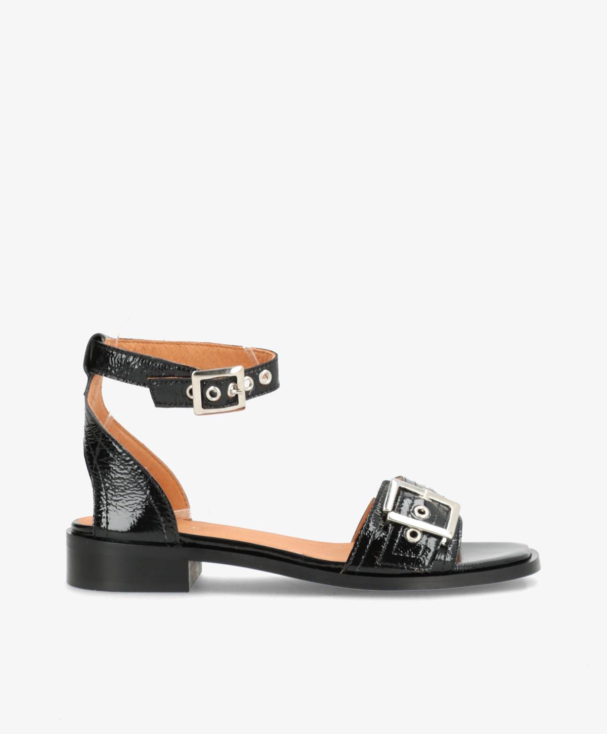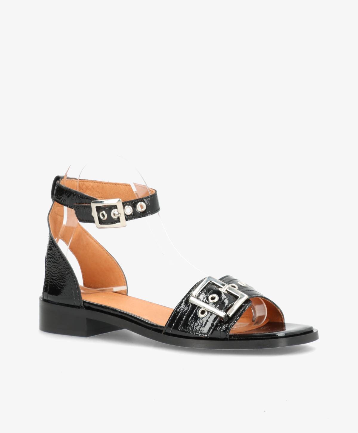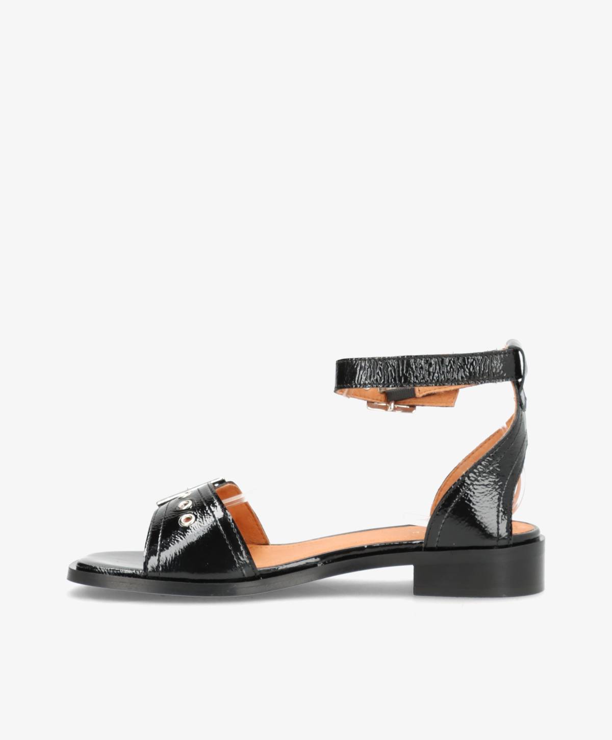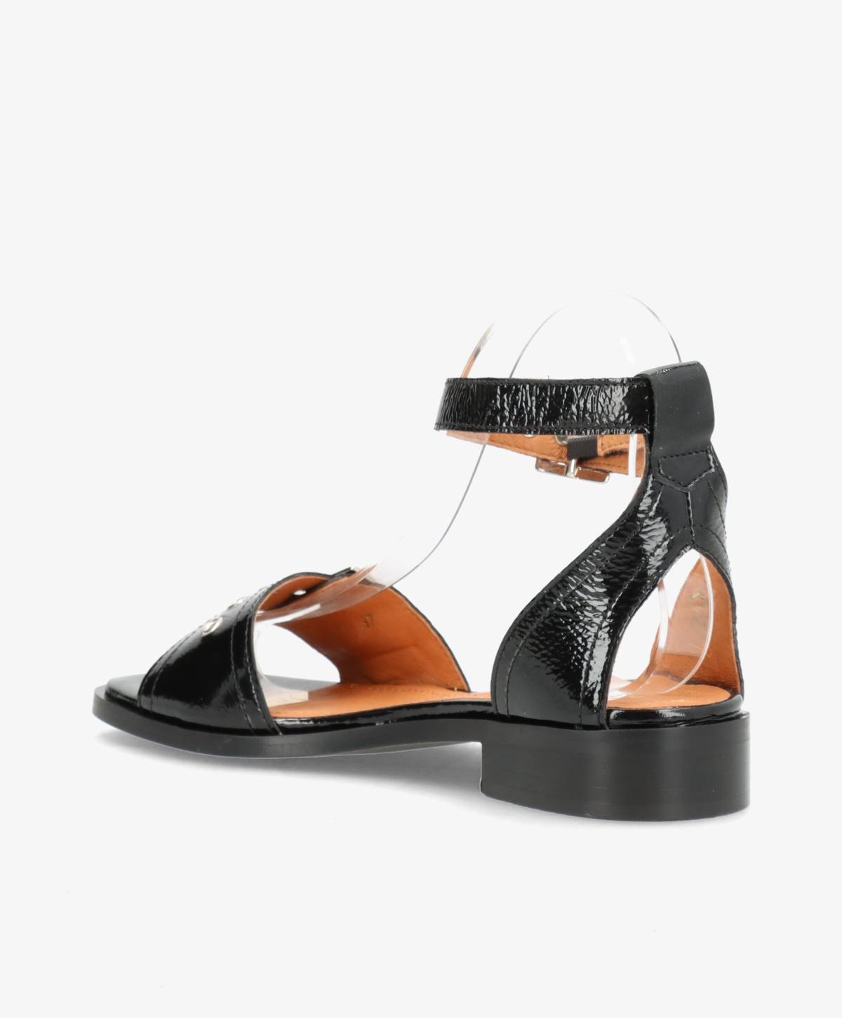 DESIRE P fra phenumb copenhagen er den perfekte kombination af edge og elegance. De sorte sandaler er udført i glansfuldt skind med dekorative spænder både over vristen og om anklen, som giver et eksklusivt og moderne look. Den flade hæl og justerbare lukning sikrer komfort hele dagen, mens de fine detaljer i metal tilføjer karakter og stil.