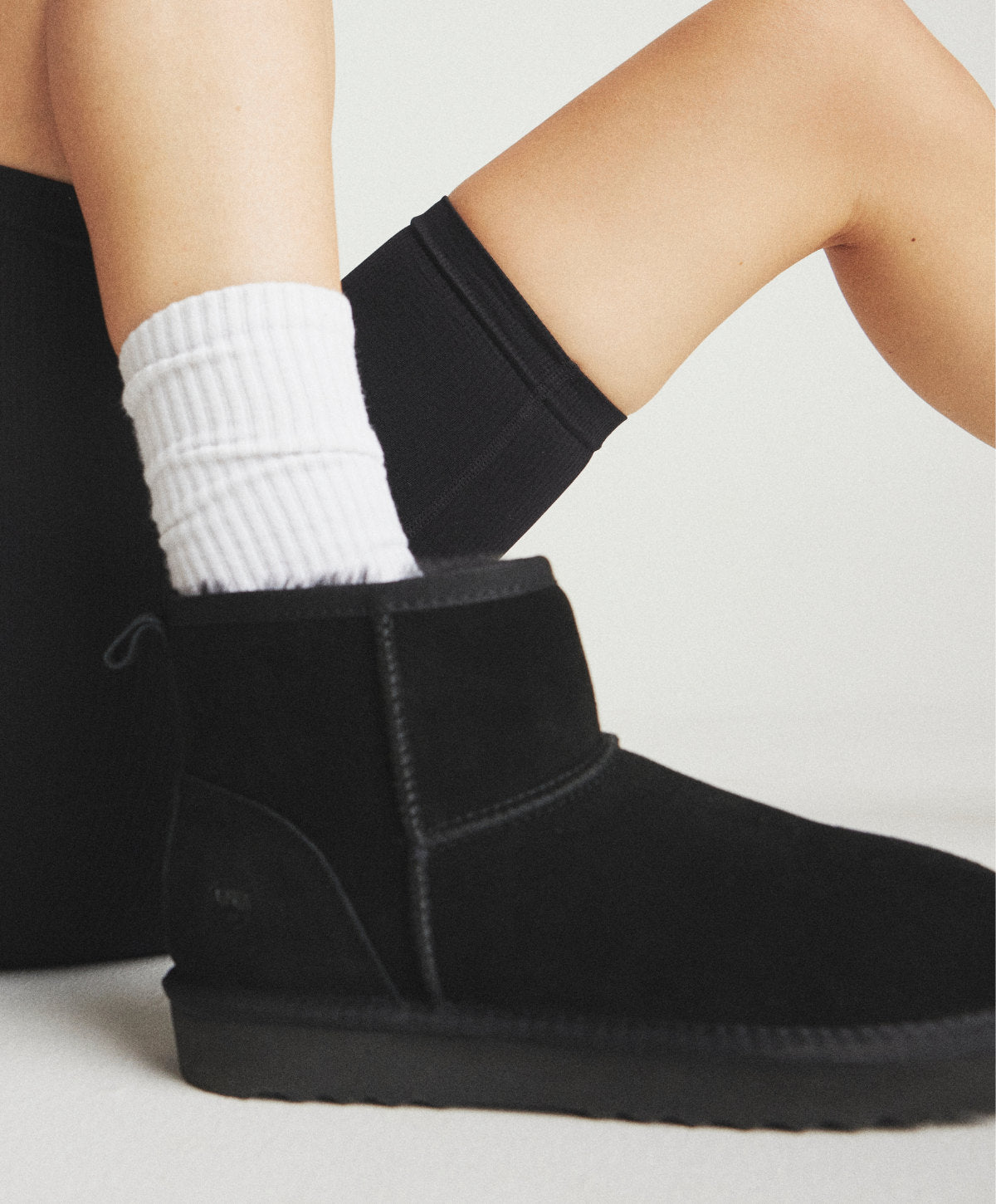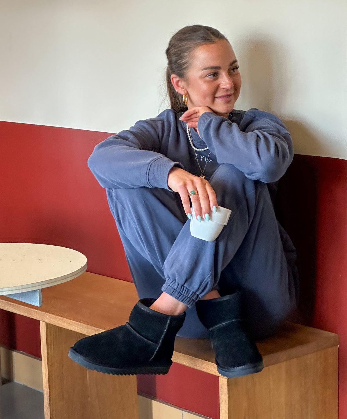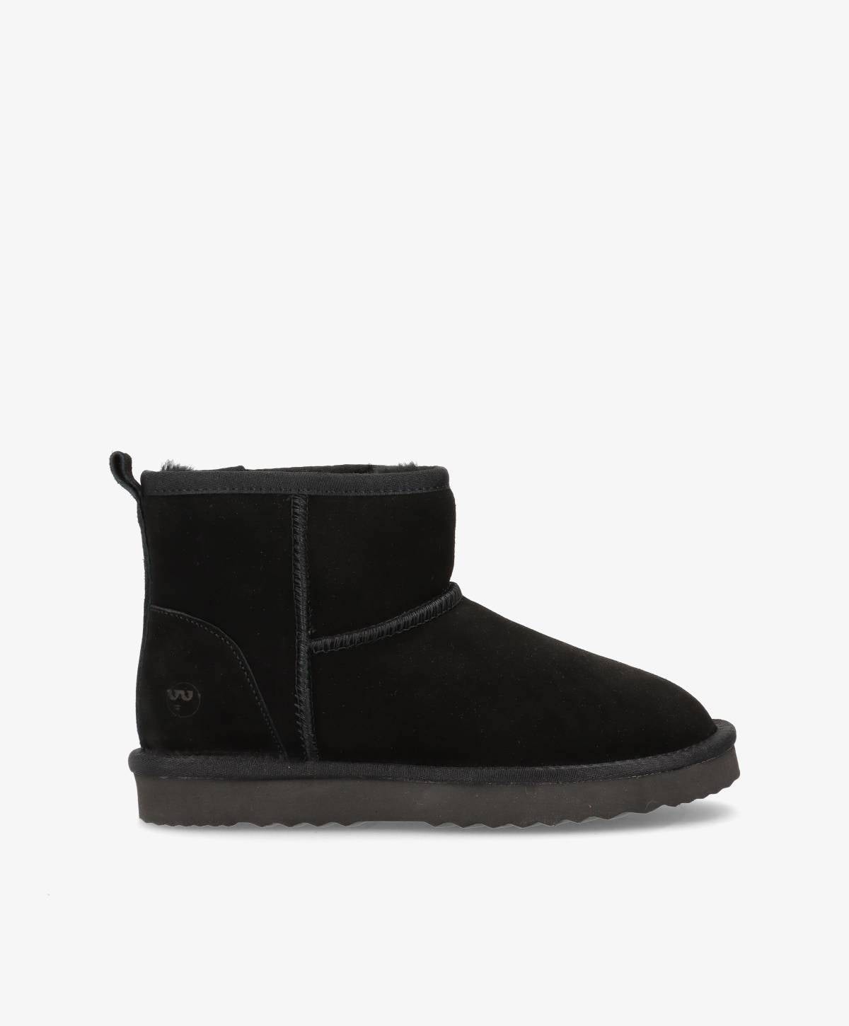 De lækreste bamsestøvler i en klassisk sort - perfekte til efterårsuniformen. De bløde støvler er lavet i et flot ruskind og har en mellemhøj sål, der er super komfortabel. Støvlerne har ægte uld foring, som holder foden varm og giver ekstra komfort. De er nemme at påføre og er super komfortable, så de roligt kan bæres hele dagen. De fine bamsestøvler har desuden tydelige syninger, som bryder det rene design lidt.