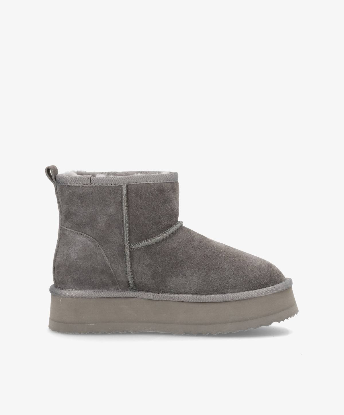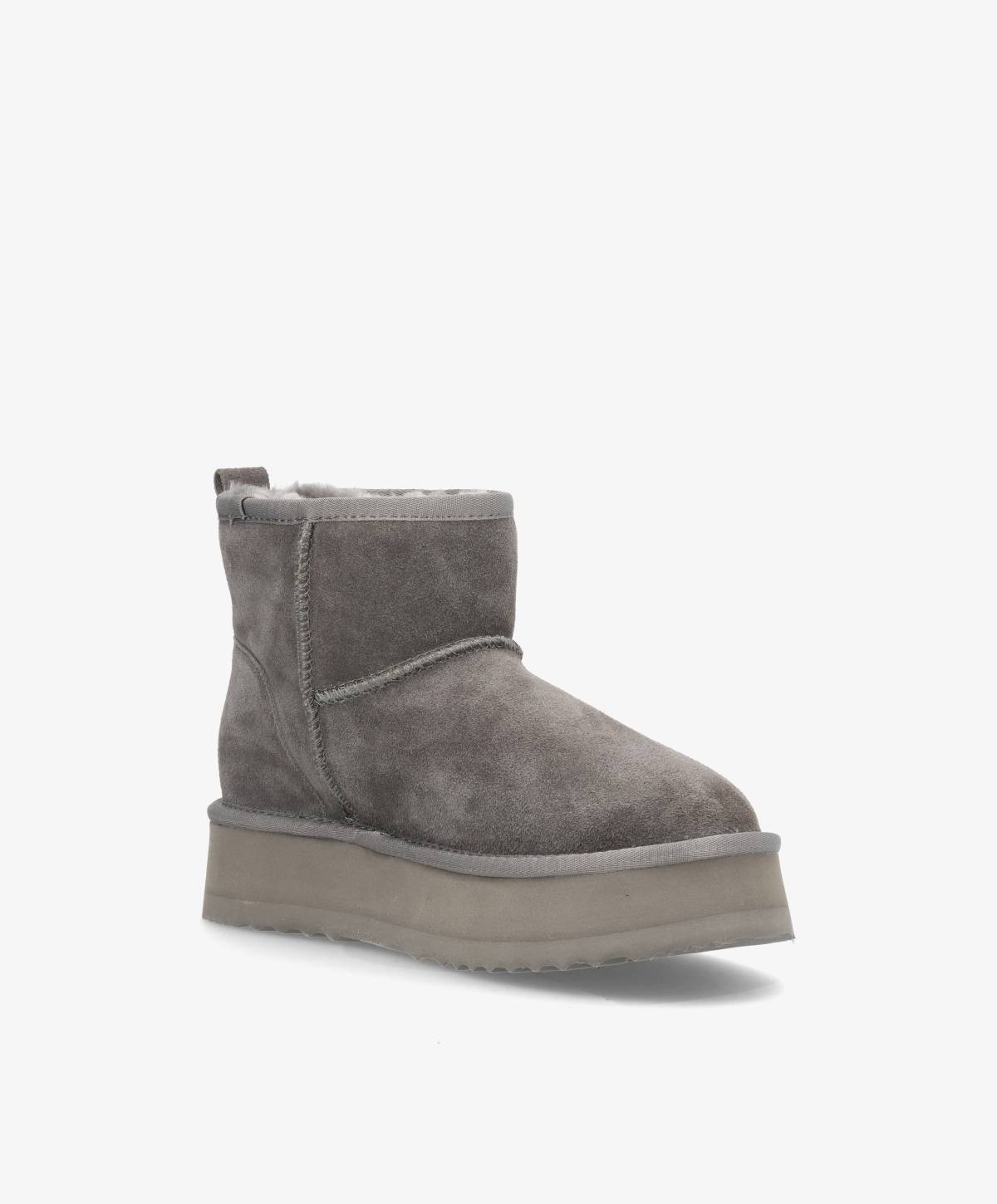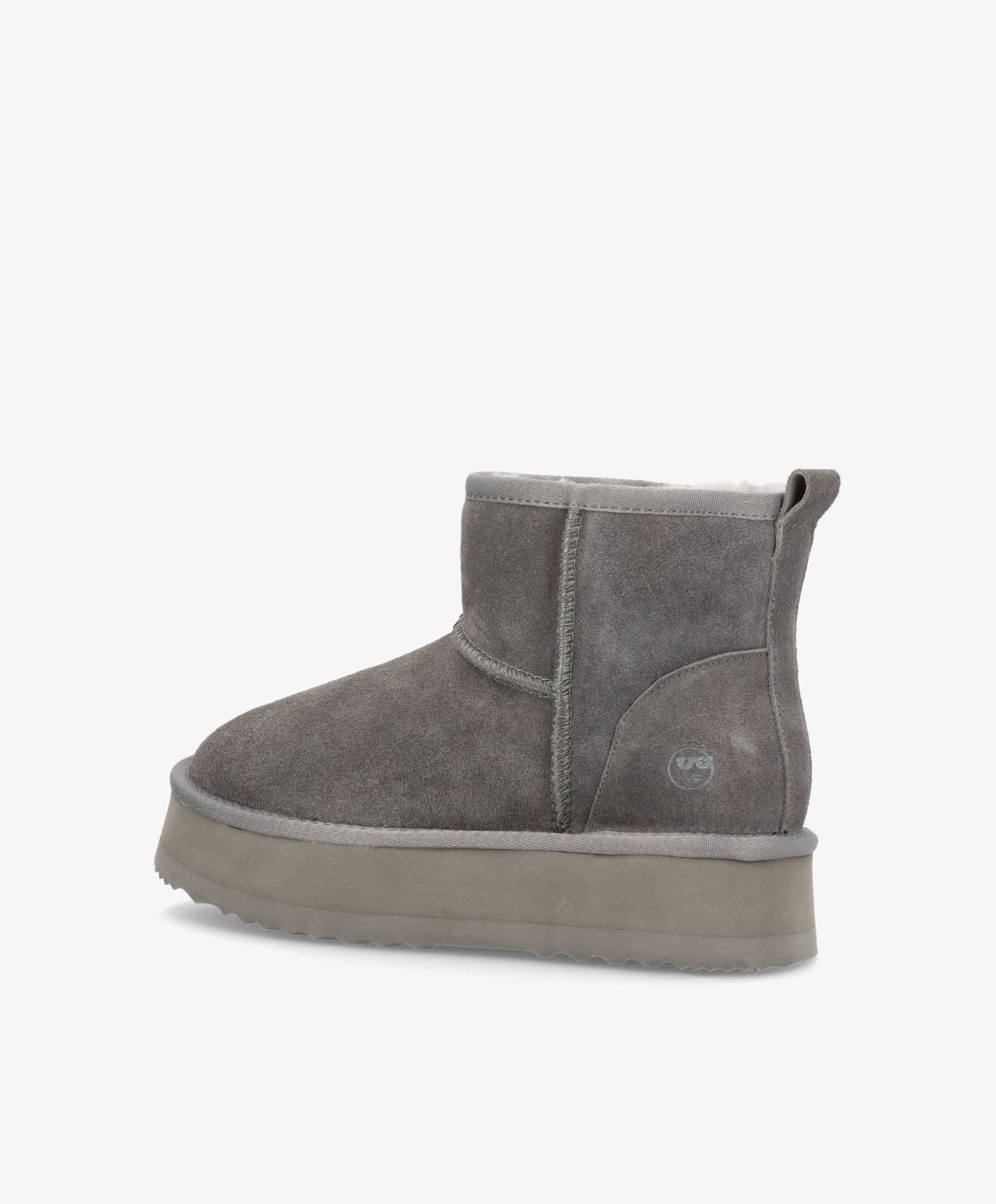 De lækreste bamsestøvler i en klassisk mørkegrå - perfekte til efterårsuniformen. De bløde støvler er lavet i et flot ruskind og har en høj sål, som giver et chunky look og løfter lidt. Støvlerne har ægte uld foring, som holder foden varm og giver ekstra komfort. De er nemme at påføre og er super komfortable, så de roligt kan bæres hele dagen. De fine bamsestøvler har desuden tydelige syninger, som bryder det rene design lidt.