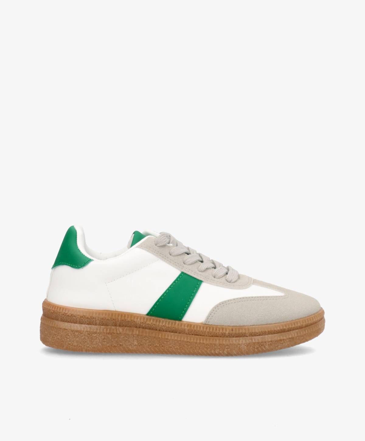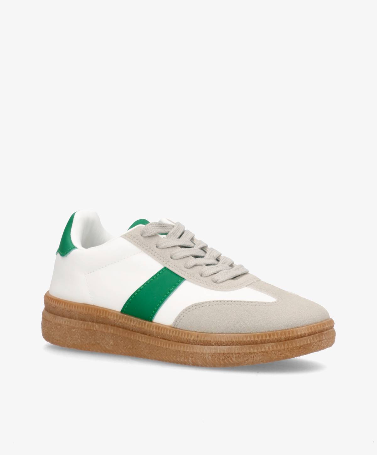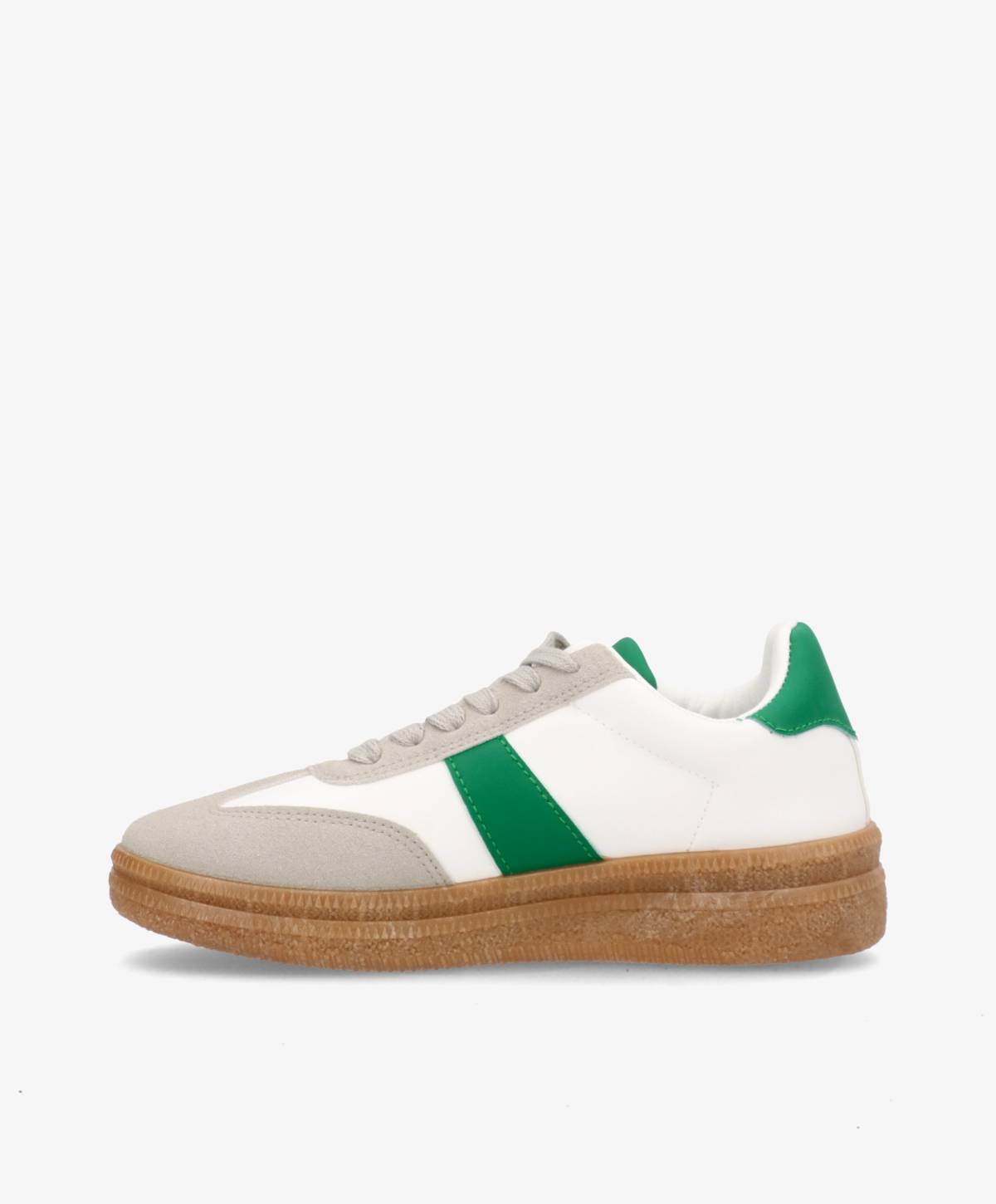 ELMA er en retro-inspireret sneaker med et moderne twist. Det klassiske design i hvidt og grå imiteret skind kombineres med friske grønne detaljer og en rågummisål, der giver masser af karakter. Overdelen i ruskindslook og de bløde kanter sikrer en komfortabel pasform hele dagen.