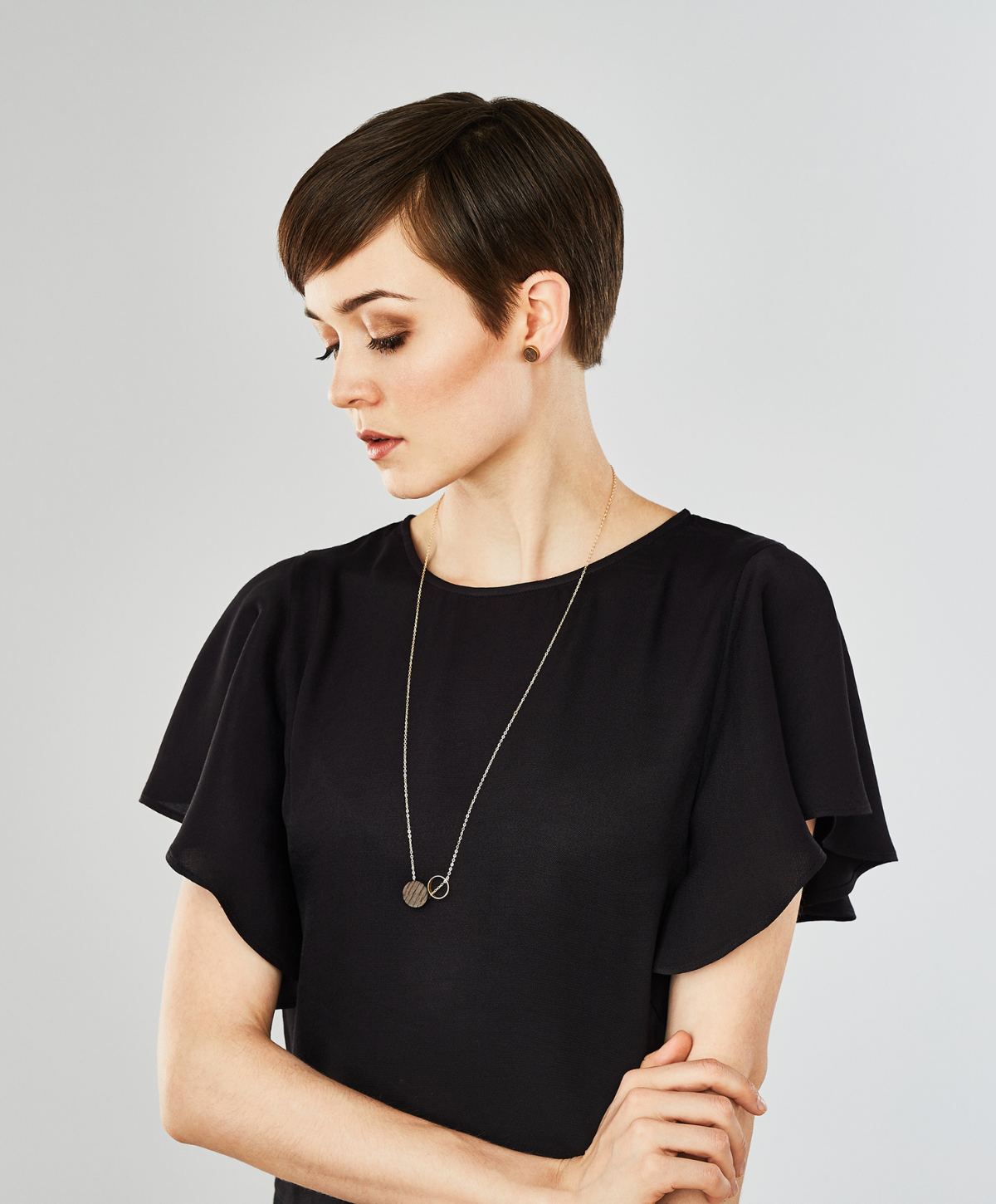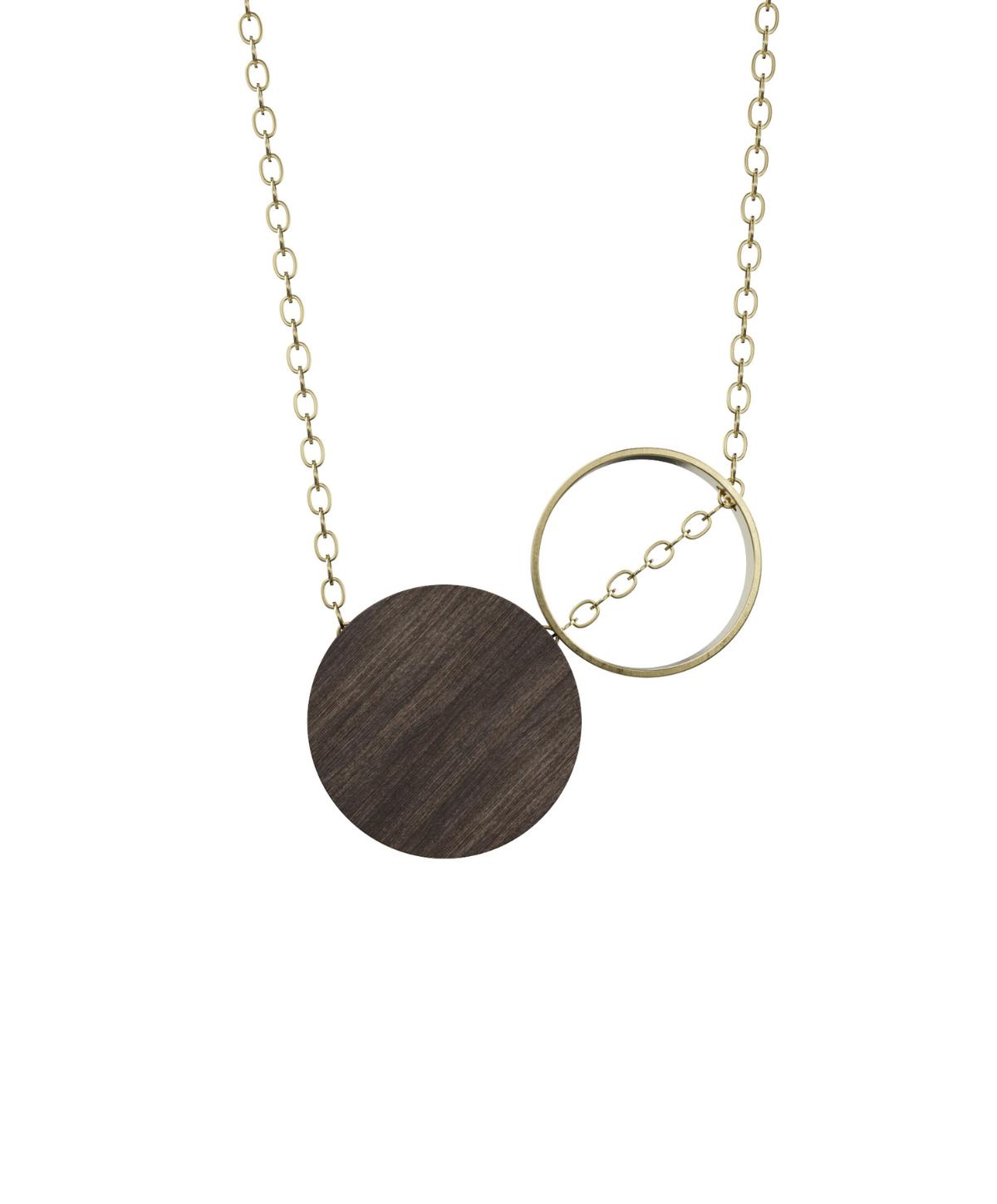 Smuk halskæde fra Grundled lavet i møkrt træ med forgyldt kæde. Halskæden er lavet med en flot 18K forgyldt messing ring, som giver et elegant look. Halskæden lukkes bagtil med lås og er udført i nikkelfri metal. Halskæden måler desuden omkring 37 cm fra lås til vedhæng.