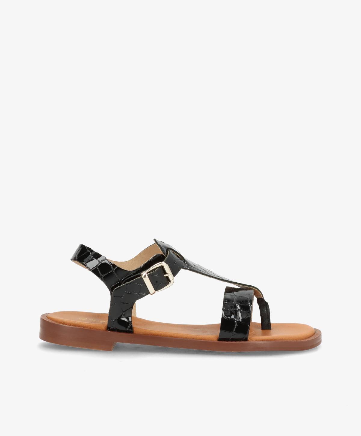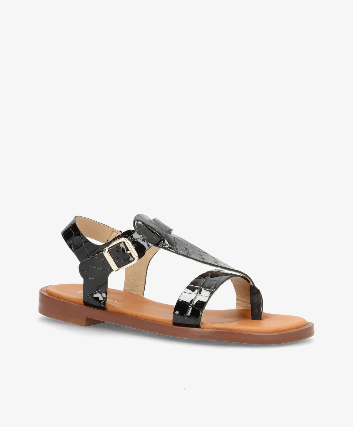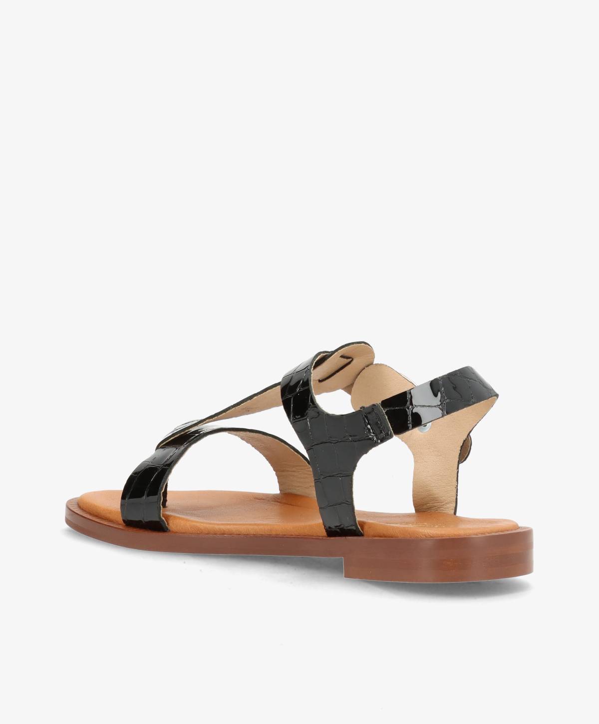 Den smukkeste Shoedesign Copenhagen sandal i et sort, præget skind. De flotte sandaler har et cool croco præg, som giver et råt touch til det stilrene design. De har en tåstrop foran, en rem der løber over foden samt en justerbar ankelrem, så de sidder super godt til på foden. Derudover kan de nemt tilpasses efter behov med den justerbare rem. Sandalerne er perfekte til hende med den klassiske stil, og kan nemt styles på et væld af måder.