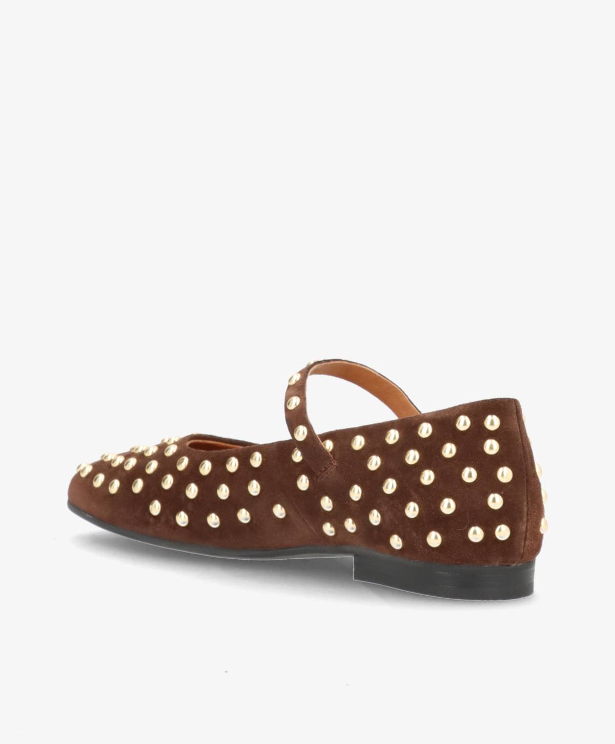 FLEUR S i mørkebrun ruskind er en elegant ballerina med rem, der kombinerer feminint design med eksklusiv kant. Den bløde ruskindsoverflade giver et luksuriøst udtryk, mens de gyldne nitter tilfører et raffineret og moderne twist. Den fine rem over vristen skaber et smukt, klassisk look og sikrer samtidig en behagelig pasform, så skoen sidder flot og stabilt på foden.
