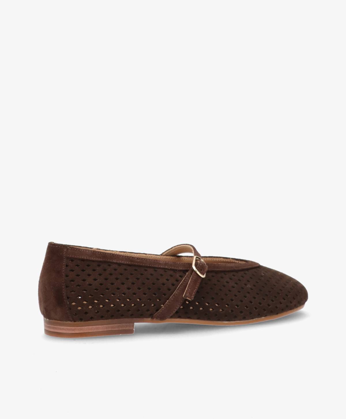 JACEY S fra Shoedesign Copenhagen i mørkebrun ruskind er en tidløs ballerina med et eksklusivt og raffineret udtryk. Det bløde ruskind kombineret med perforerede detaljer skaber en let og elegant silhuet, mens den fine rem over vristen giver både karakter og komfort.