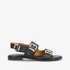 JUNE fra shoedesign copenhagen er en moderne flad sandal i sort læder med et eksklusivt og markant udtryk. De brede remme kombineret med de dekorative guldfarvede spænder giver sandalen kant og karakter, samtidig med at de sikrer en justerbar og behagelig pasform.