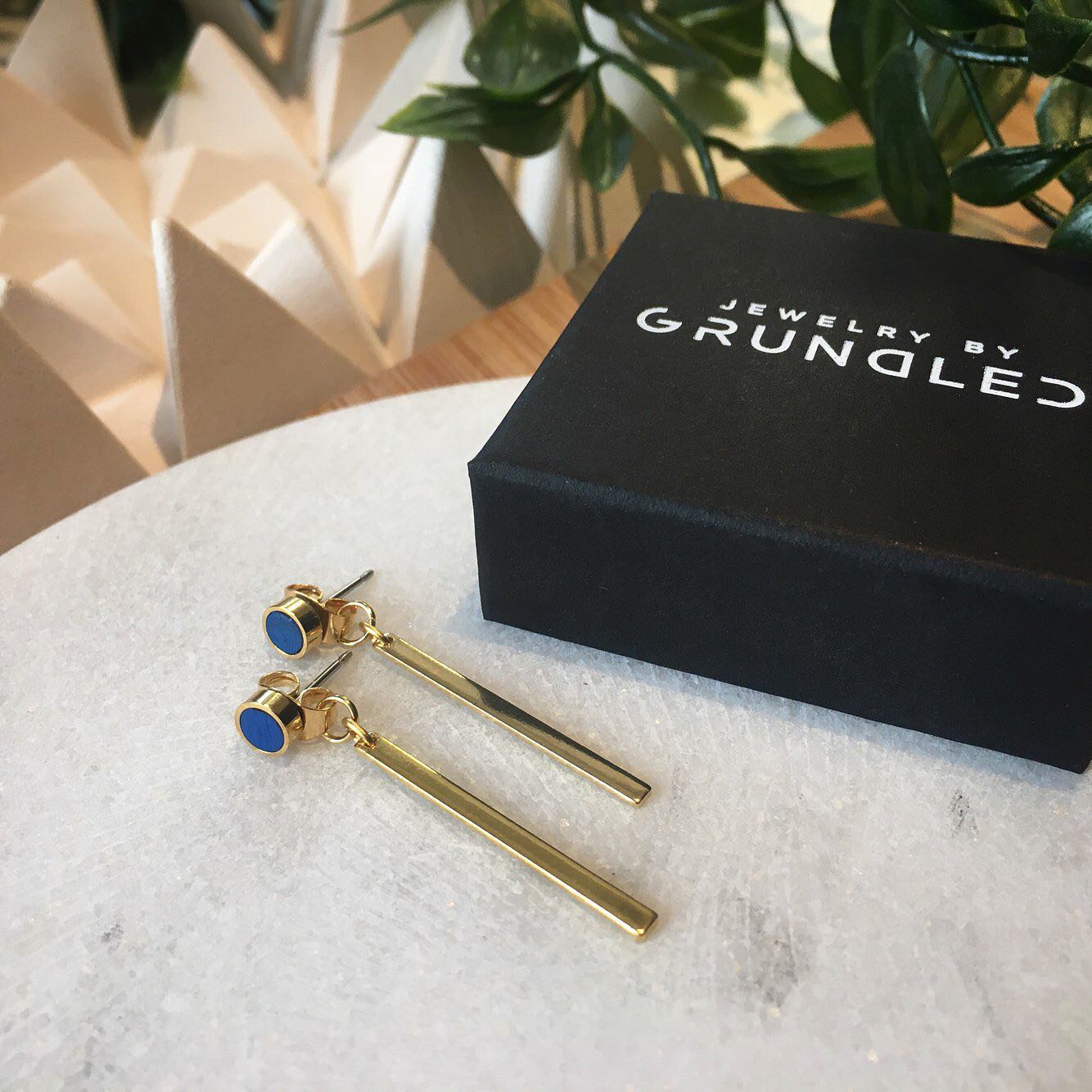 Elegante ørestikker fra Grundled. De flotte ørestikker er lavet i et trendy design med en elegant cirkel af forgyldt messing rundt om en farvet træ-cirkel. Ørestikkerne måler 5 mm i diameter, med en elegant plade på 3,5 cm hængende fra låsen.