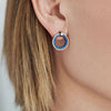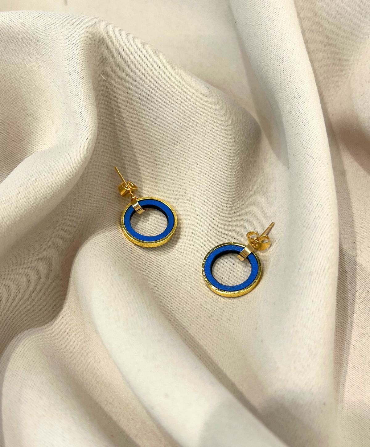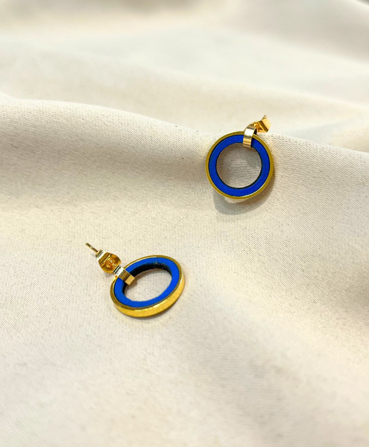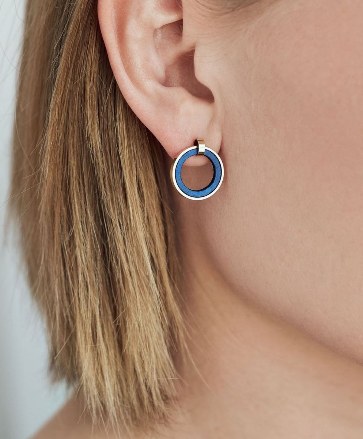 Smukke øreringe fra Grundled med et pift af farve. De elegante øreringe er lavet i farvet træ og har en simpel ring af forgyldt sølv rundt om. De lukkes bagtil med lås, og er udført i forgyldt messing. Øreringene måler 1,7 cm i diameter. De smukke øreringe er desuden nikkelfri.