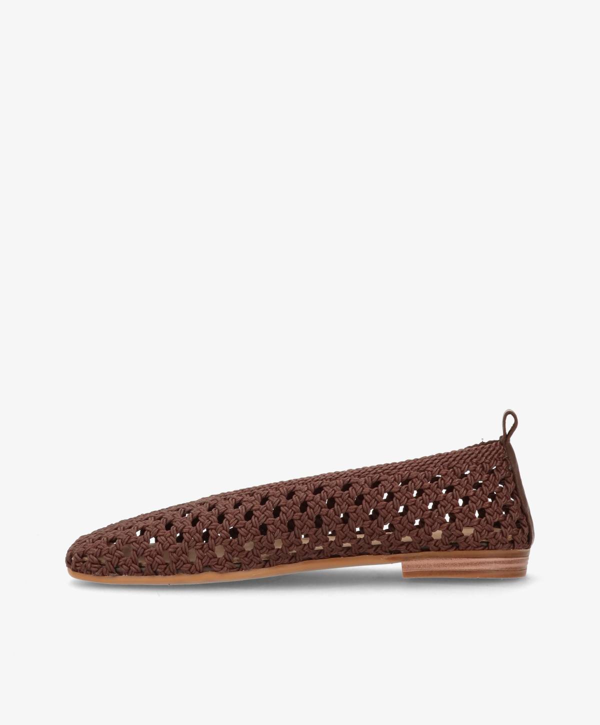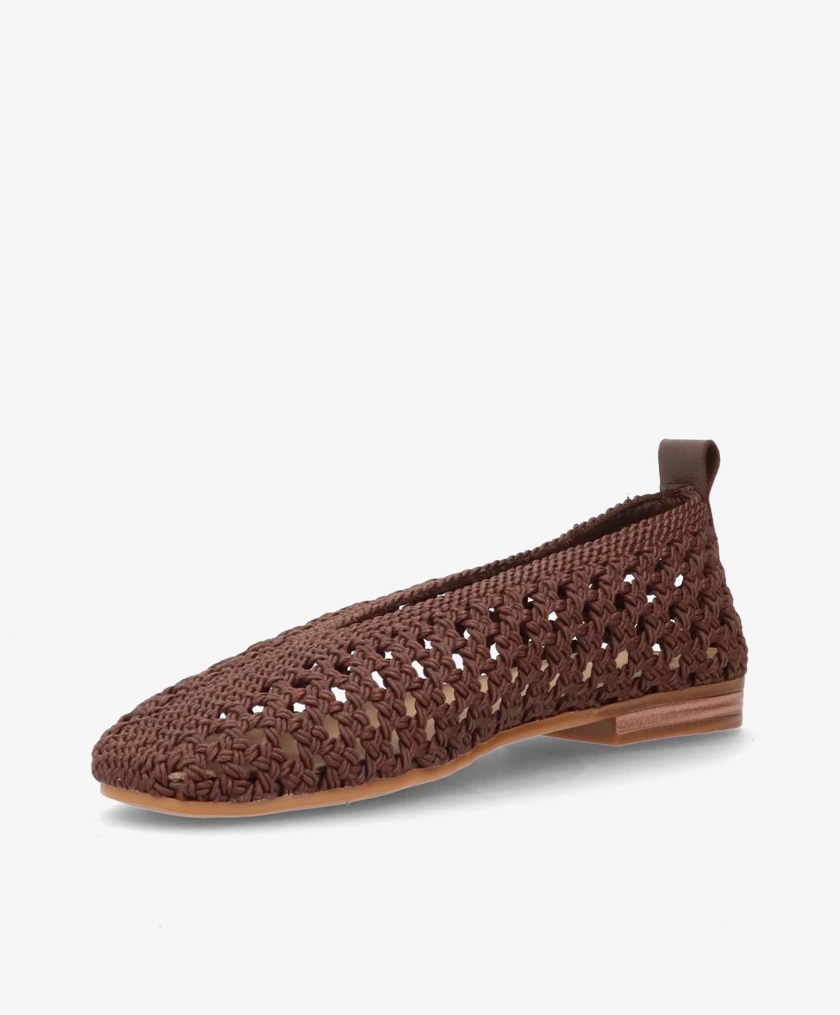 NEEVA Tx fra Shoedesign Copenhagen er en elegant ballerina med et moderne og sofistikeret udtryk. Den mørkebrune, flettede tekstiloverdel giver skoen en let og luftig karakter, mens den spidse silhuet tilfører et eksklusivt touch. Det fine håndværk og det vævede design skaber et raffineret look, der skiller sig ud og samtidig føles feminint og stilrent.