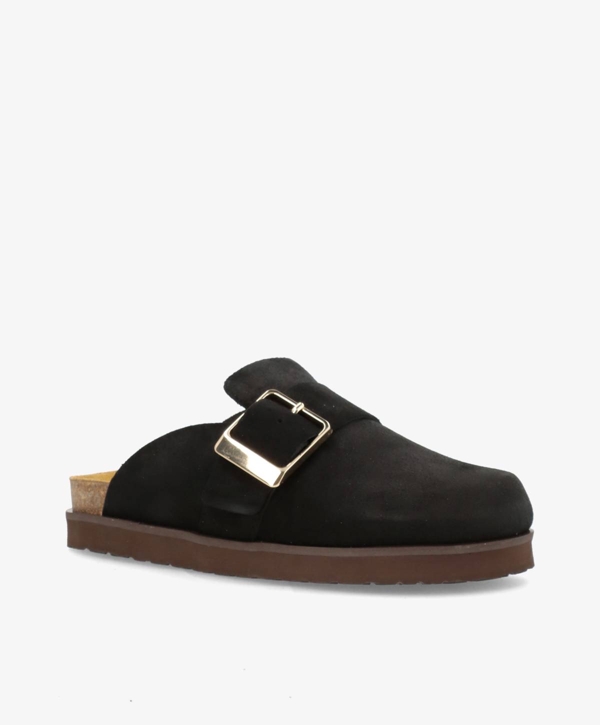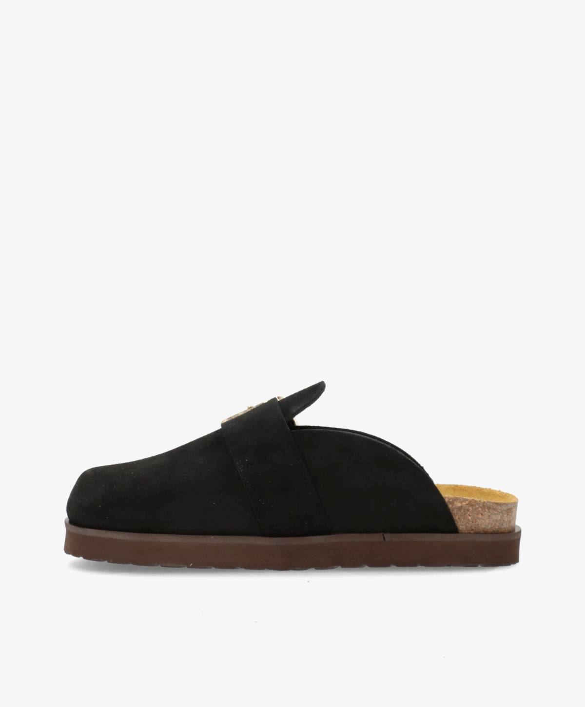 OFELIA er den perfekte blanding af moderne minimalisme og cool attitude. Mule-design i blødt sort ruskind kombineret med en stor, gylden spænde giver et sofistikeret udtryk, som både er afslappet og fashion forward. Den ergonomiske korksål sikrer komfort hele dagen, mens den mørke ydersål understreger det gennemførte look.