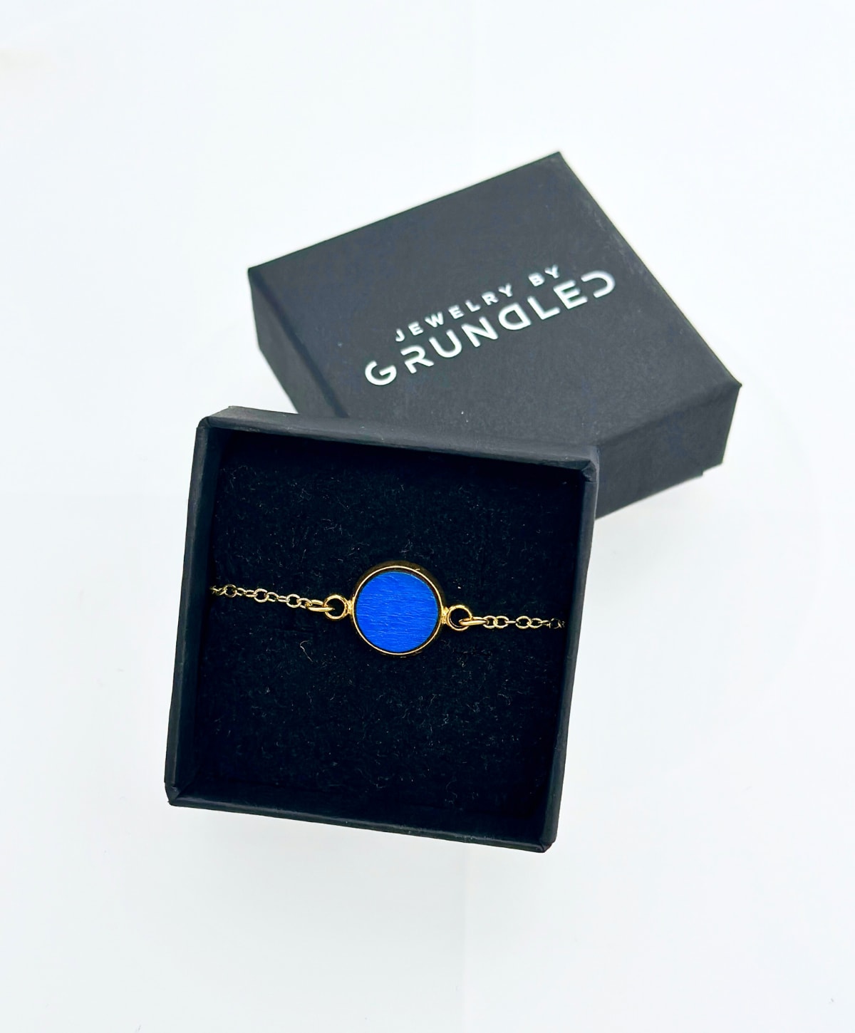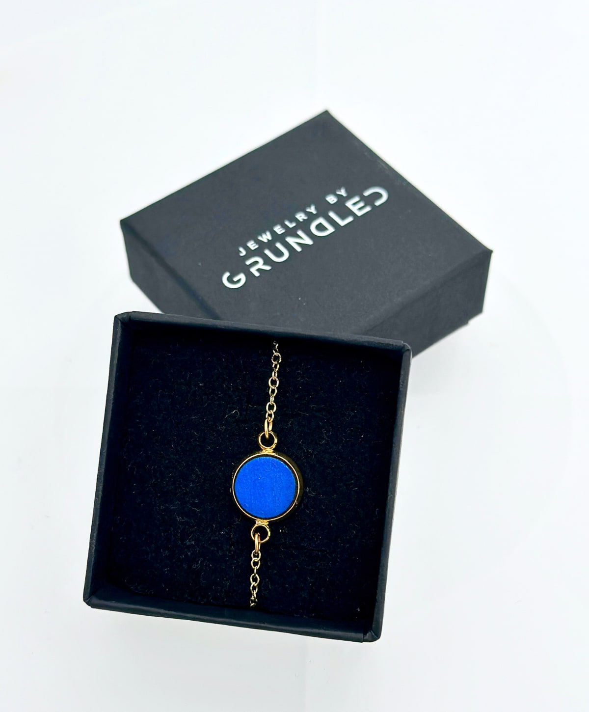 Elegant armbånd fra Grundled, med farverige detaljer. Det flotte armbånd er lavet i farvet træ og har en simpel ring af forgyldt metal rundt om. Den forgyldte kæde lukkes bagtil med lås. Armbåndet har en længde på 20 cm, og har forskellige låsemuligheder så den kan tilpasses dit håndled.