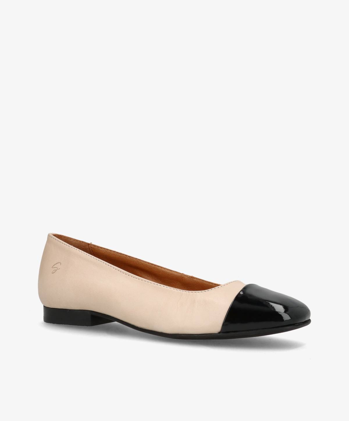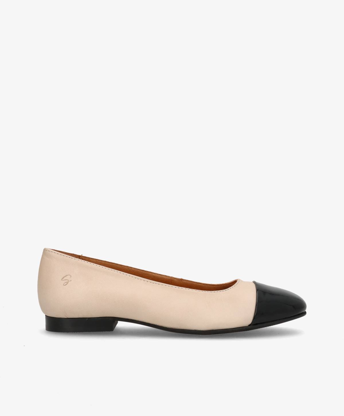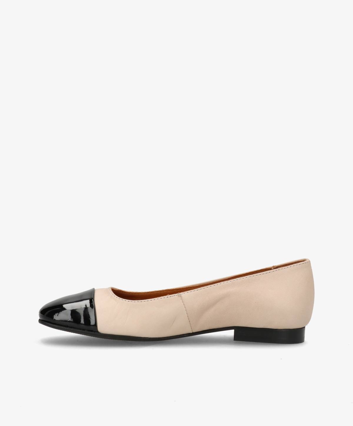 Feminine og elegante ballerinaer fra Shoedesign Copenhagen i en tidløs beige. De fine ballerinaer får en flot kontrast med den sorte patentsnude, og på siden er de prydet med brandets flotte logo. De smukke ballerinaer har en spids snude, og er nemme at påføre med den åbne pasform. De kan nemt styles til et væld af outfits, og bliver lynhurtigt en favorit i garderoben.