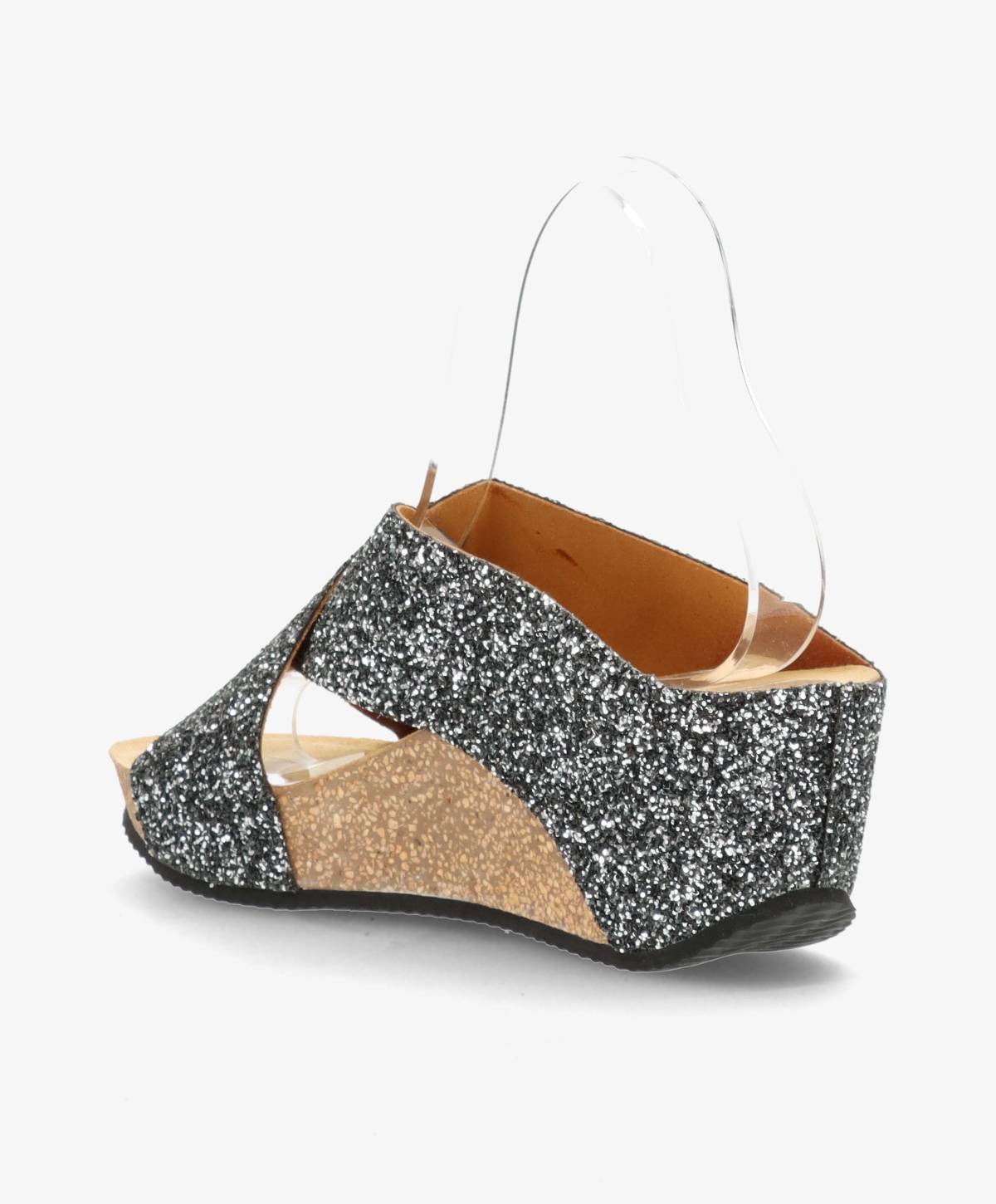 Disse glitter sandaler i sort/sølv er perfekte til at tilføje et glimtende touch til enhver sommergarderobe. Designet med en komfortabel kilehæl, der giver dig et løft, samtidig med at du beholder maksimal komfort. Det krydsede design foran skaber en stilfuld og elegant silhuet.