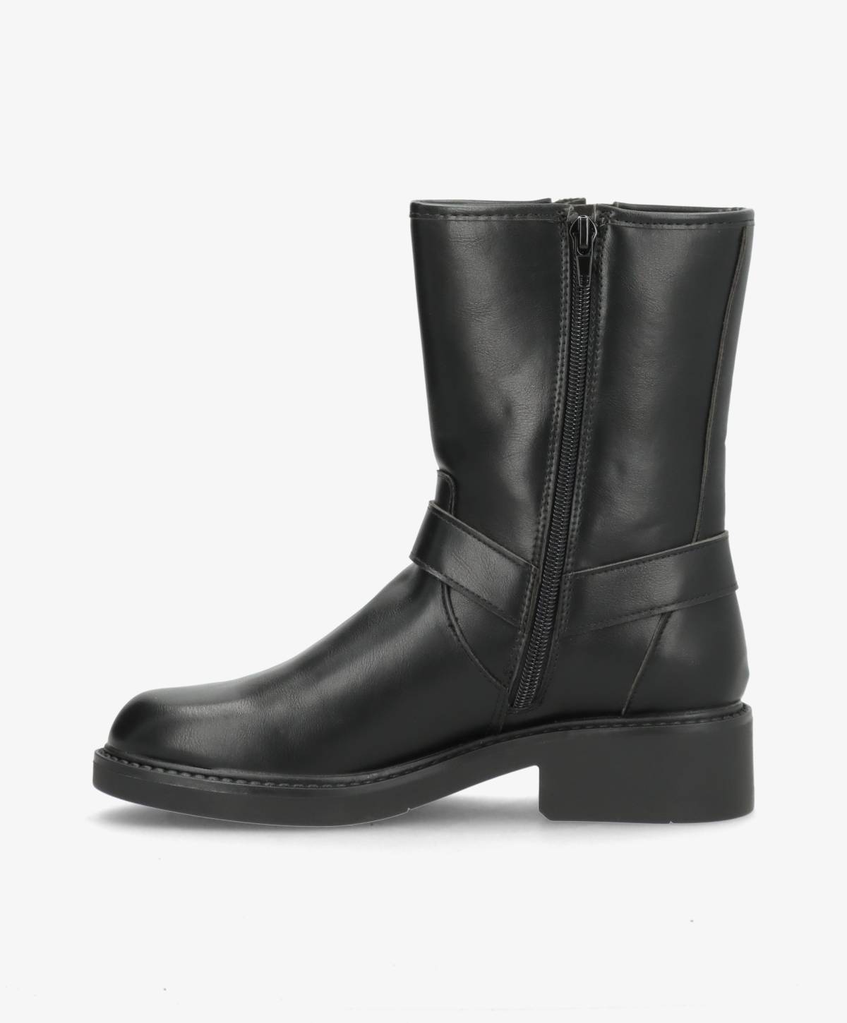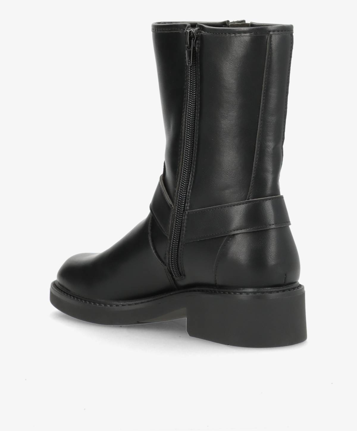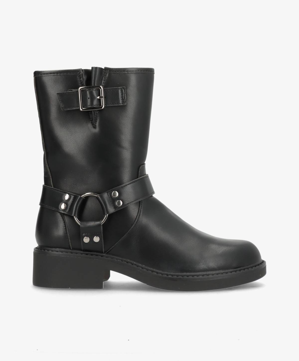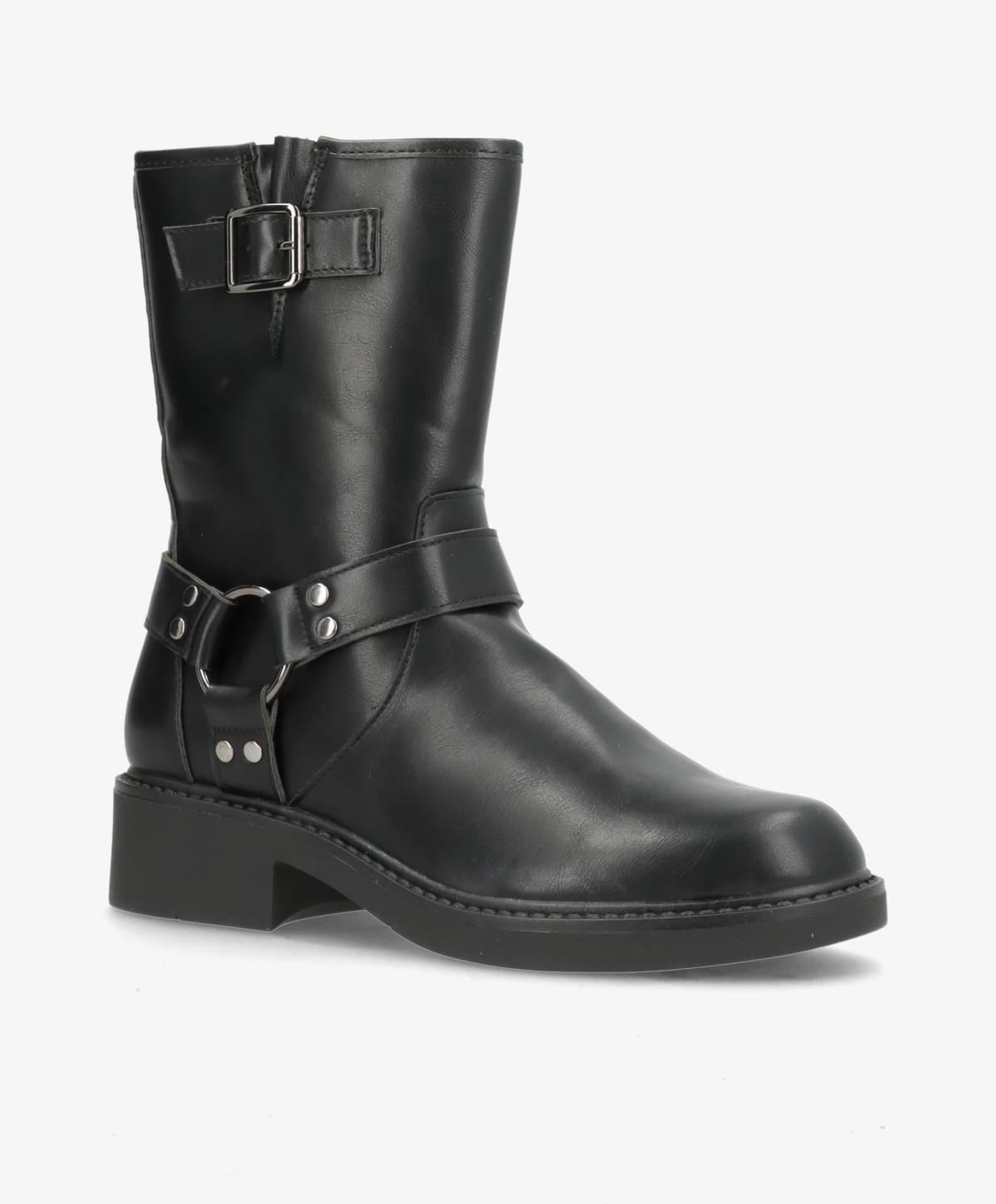 Denne sorte støvle fra Claudia Ghizzani er en moderne fortolkning af den klassiske bikerstøvle. Støvlen er fremstillet af kunstlæder, hvilket giver den et stilrent udseende, samtidig med at den er let at vedligeholde. De markante remme og spænder tilføjer et råt og urbant udtryk - perfekt til dig der ønsker at tilføre kant til dit outfit. Støvlen har en normal pasform, hvilket gør den behagelig at have på hele dagen. Med en praktisk lynlås på siden er det nemt at tage støvlen af og på, og den solide sål sikrer et godt greb, uanset hvor du går. Denne støvle er ideel til både hverdag og weekendens aktiviteter, hvor stil og komfort går hånd i hånd.