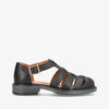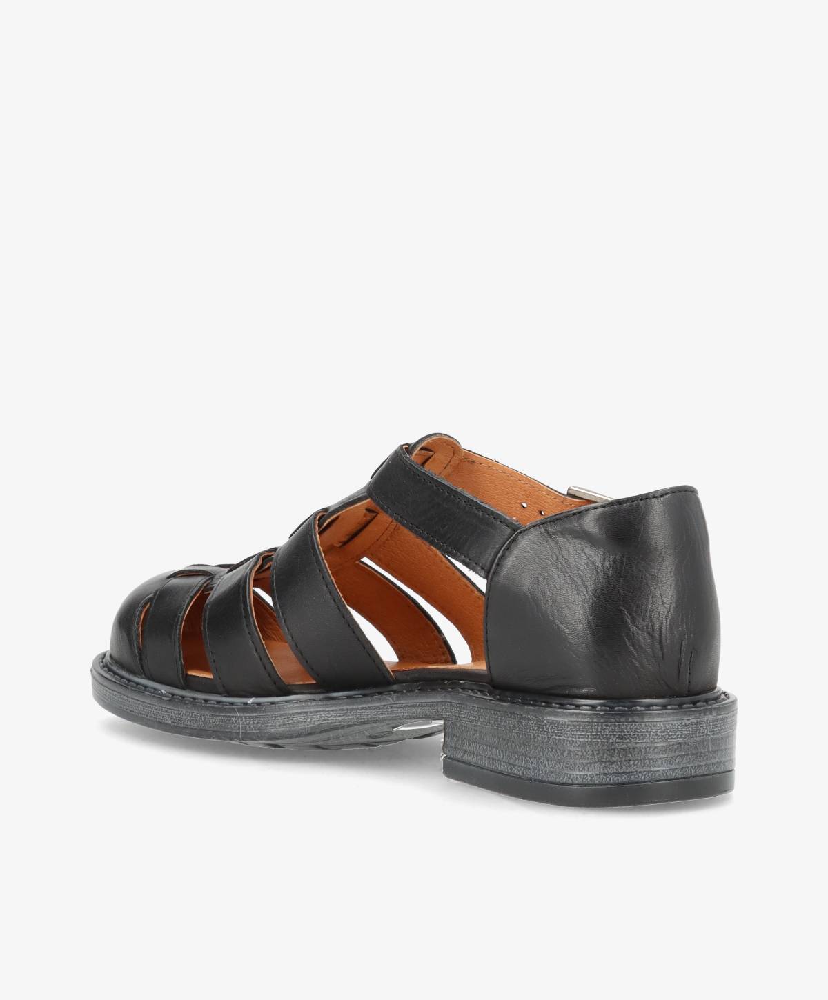 Denne sorte lædersandal er et stilrent valg til dig, der ønsker et klassisk og alsidigt udtryk. Det glatte, sorte læder giver et elegant look, som nemt kan styles til både hverdag og mere formelle anledninger. Sandalen har lukket tå, der beskytter foden og tilfører et sofistikeret præg, samt en fast hælkappe, som giver ekstra støtte og stabilitet. Det justerbare spænde ved anklen sikrer, at du kan tilpasse pasformen, så sandalen sidder behageligt hele dagen.
